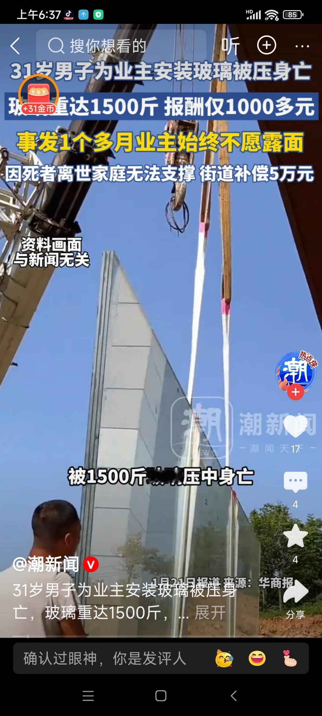 震惊!一块500斤巨型玻璃引发命案,背后隐藏的安全隐患令人发指! (素材来自网络) 在这个快节奏、追求效率的时代,安全事故似乎变得越来越频繁。而最近发生在西安的一起悲剧,更是让人触目惊心:一块重达500斤的超大玻璃,竟然在施工现场因疏忽倒下,导致一名年轻工人当场遇难。这起事故不仅让人扼腕叹息,更暴露出建筑行业长期以来的安全隐患与管理漏洞。 事情的起因,源于一块超白玻璃——长三米、高一米五、厚得像字典般的“巨无霸”。这块玻璃是业主为别墅打造海景鱼池专门订制的,物流只到小区门口,搬运难度极大。于是,业主找到袁亮,装修队的小工头,出于对家庭的责任感,他咬牙答应帮忙抬这块“巨无霸”。为了节省时间,袁亮和工友们用滚木、撬棍费劲地将玻璃滑下台阶,最终挪到施工坑里。这个坑深一米多,刚好卡住玻璃,但施工流程本应包括焊钢框、做支撑、打临时木楔、调水平、灌胶等一系列严格工序。 然而,业主催促赶工,施工方为了节省时间,省略了许多关键步骤。袁亮为了赶工,将玻璃立起来,自己用手扶着,习惯性地点燃一支烟。就在这一瞬间,玻璃的重心偏移,像喝醉的巨人般倒下。工友小李跑来,只见师父的两条腿还露在外面,但上半身却被沉重的玻璃压得严严实实。喊破嗓子也无法挪动那块“铁板”,只能拨打120急救电话。 可惜,救援来得太晚。袁亮因头部受到重创,血流不止,最终不幸遇难。悲剧发生后,老舅李师傅赶到现场,望着盖在身上的蓝布,眼泪止不住地流:“娃才三十出头,房贷还剩二十五年,娃的幼儿园学费刚交完,就没了。”更令人愤怒的是,业主只露面一次,留下“走法律程序”的冷漠回应;物业也推诿责任,说“私挖鱼池,我们不知情”;装修平台更是以“私下接活”为由冻结袁亮的账号。袁亮一家只得租住在临潼的一间30多平的小套间,老人高血压,孩子才四岁,赔偿问题遥遥无期,家里的“棺材钱”都由亲戚垫付。 这场悲剧其实早有预警。那块玻璃没有钢框、没有吸盘、没有防倒链,连个警示牌都没有。坑边堆满碎砖、木梯,施工现场极其不安全。业内人士一眼就能看出:如此巨大的玻璃,必须用两台真空吸盘吊机配合,四边同时受力,焊上固定角钢,等结构胶干透后才能撤支撑。而这些“麻烦”的工序,却被“赶工”压力所取代,省下的不是时间,而是生命。 类似的悲剧并非孤例。去年深圳中金大厦,六块幕墙玻璃没有做防倒措施,结果发生倾倒事故,工人吴某被压成重伤不治;更早之前,重庆一所学校天井的玻璃没有安装护栏,工人黄师傅安全带断裂,从五楼坠落身亡。这些事故的共同原因,无一例外,是安全意识淡薄、现场管理失控。施工方为了节省几百块钱、抢几天工期,竟然用生命在赌。 袁亮的离去,带走了一个年轻的生命,也让无数家庭陷入绝望。妻子换上黑白头像,朋友圈只剩一句:“等你回家。”女儿半夜哭醒,梦见爸爸在楼下喊她名字。李师傅跑遍各个部门,递交材料,却只得到“正在调查”的答复。袁亮的照片被保存在手机里,他常常告诉身边的人:“别再图省事,别再省那几根钢管、几个螺丝,否则,命就会像烟灰一样散去。” 这起事故暴露出建筑行业长期以来的“潜规则”:为了赶工、节省成本,许多施工现场都在安全措施上打折扣。没有钢框、没有吸盘、没有防倒链,甚至没有明显的警示标志。业内人士指出,像如此沉重的玻璃,必须用专业的吊装设备和严格的固定措施,否则极易发生倾倒事故。去年深圳中金大厦的幕墙玻璃倒塌,重庆学校天井的坠落悲剧,都是因为施工安全措施不到位,安全意识淡薄。 这场悲剧也让人深思:在追求效率和速度的背后,安全到底被放在了什么位置?每一块巨大的玻璃、每一根钢管、每一道工序,都关系到工人的生命。我们不能再让“赶工”成为夺走生命的借口,也不能让“省事”成为摧毁家庭的罪魁祸首。 事故发生后,袁亮的家人陷入了无尽的悲痛。妻子在微信上换上了黑白头像,朋友圈只剩一句“等你回家”。女儿在半夜哭醒,梦见爸爸在楼下喊她的名字。老舅李师傅跑遍了相关部门,递交了一摞材料,却只得到“正在调查”的回复。袁亮的照片被存入手机,逢人便劝:“别再图省事,别再省那几根钢管、几个螺丝,否则,生命就像烟灰一样,随风散去。” 这起事故的场景依然清晰地印在每个人的脑海里:那块沉重的玻璃,戳在坑底,被绿围挡遮盖,血迹被雨水冲刷得模糊,但那惨烈的画面,却久久难以忘怀。它像一道警钟,敲响在每一个建筑工地的角落,也敲响在每一个关注安全的人心中。 我们呼吁:建筑行业必须引以为戒,严格落实安全措施。施工企业要对每一项工序负责,不能为了赶工、省钱而牺牲工人的生命。政府部门要加强监管,严惩安全违规行为,确保每一位工人在安全的环境中工作。每个人都应成为安全的守护者,让悲剧不再重演。玻璃砸伤人 玻璃搬运事故
