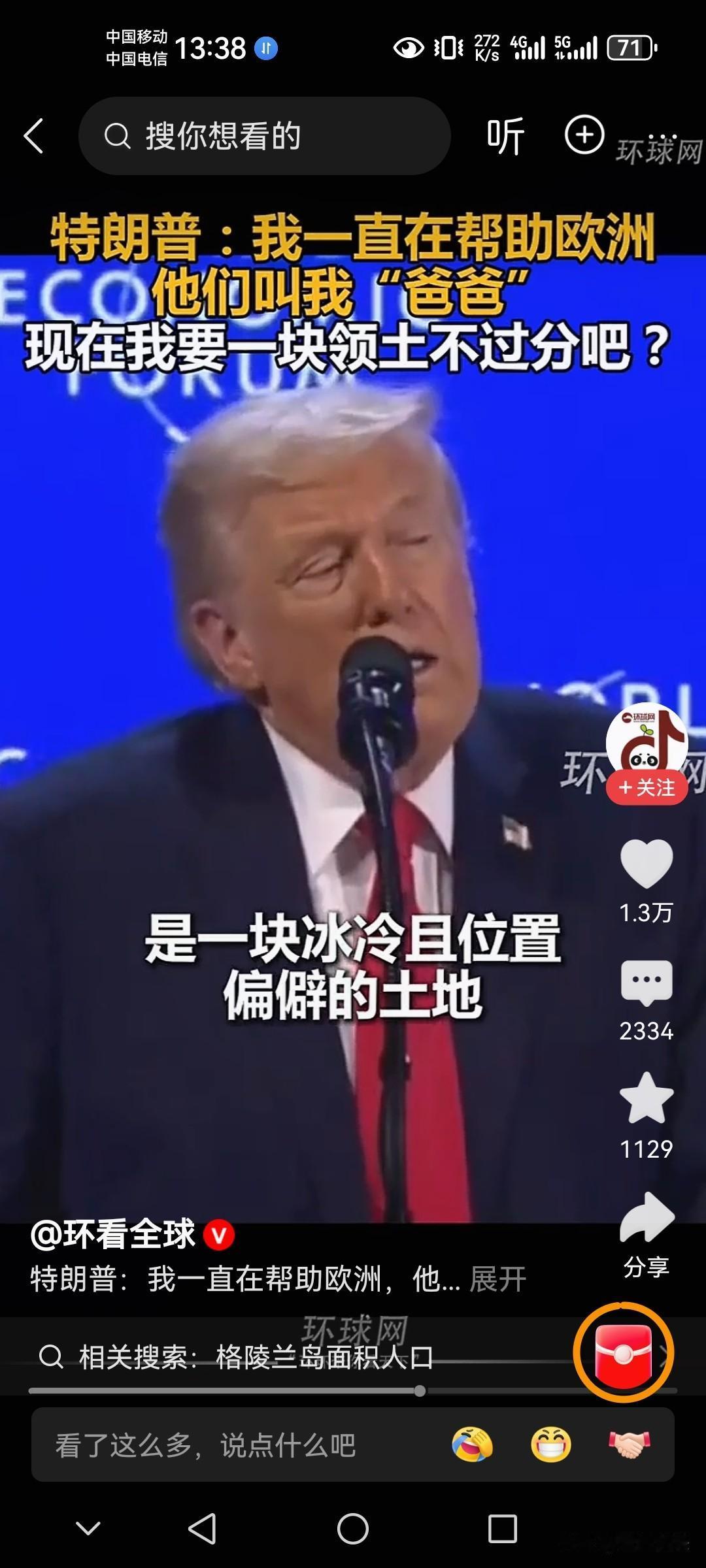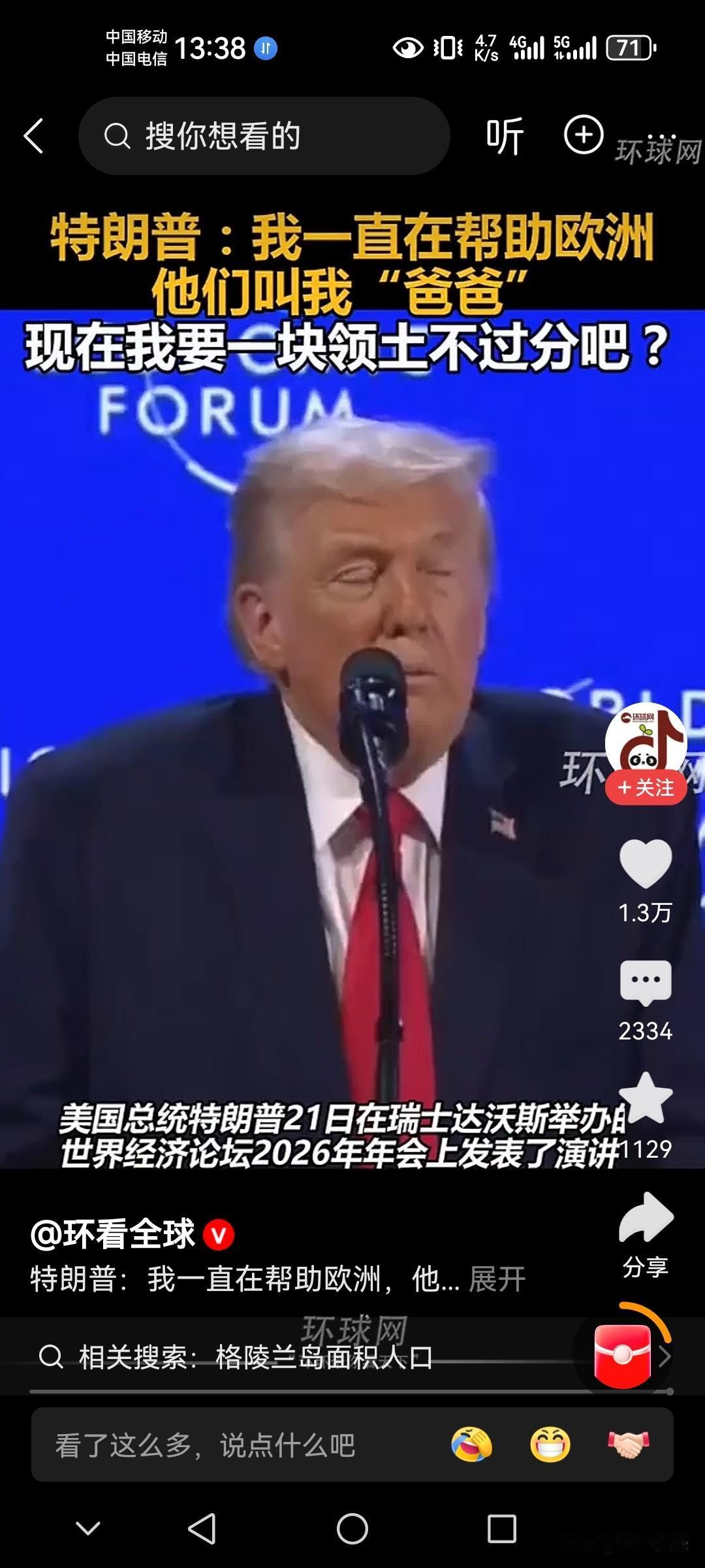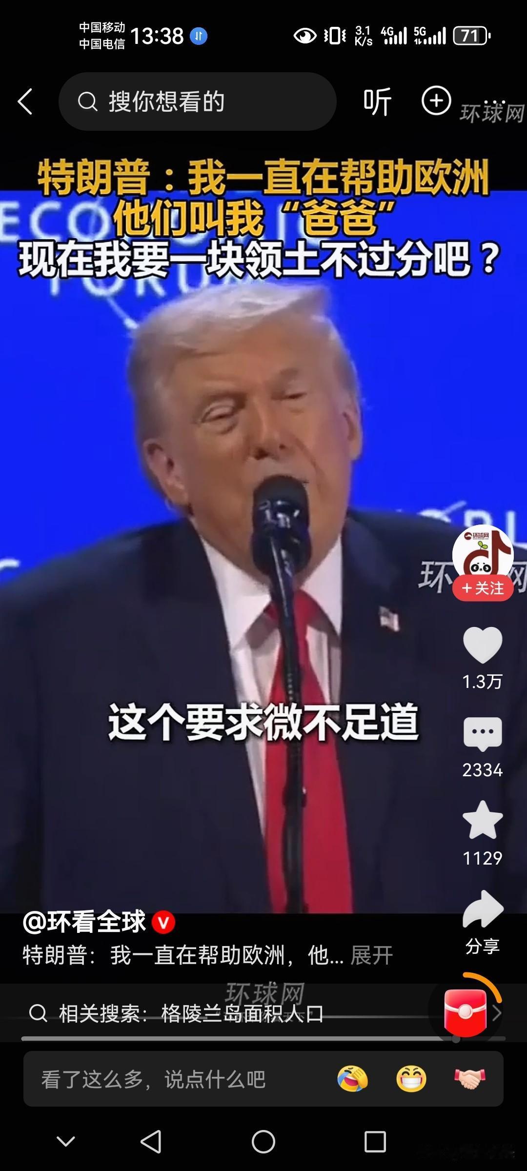 特朗普打心里没有把北约和欧洲放在眼里! 完全就是天大地大我最大的傲慢心态! 整个达沃斯经济论坛变成了特朗普的个人表演秀,特朗普各种抱怨和索取! 明明自己贪得无厌,还表现出一副委屈巴巴的样子! 特朗普称:我一直在帮助欧洲付出了很多,他们甚至叫我“爸爸”,分一块冰冷且位置偏僻的土地,不过分吧,这个要求微不足道! 在特朗普眼里,索取他国土地,脚踏他国主权,变成了交易和买卖!威逼加利诱,不达目的誓不罢休! 特朗普对格陵兰岛那是势在必得! 格陵兰岛自治政府也提醒居民备好应急物质和猎枪等!防范即将到来的危险!欧洲对特朗普 聊特朗普 特朗普经济霸权 欧盟反击特朗普 川普特朗普 丹麦怒怼特朗普