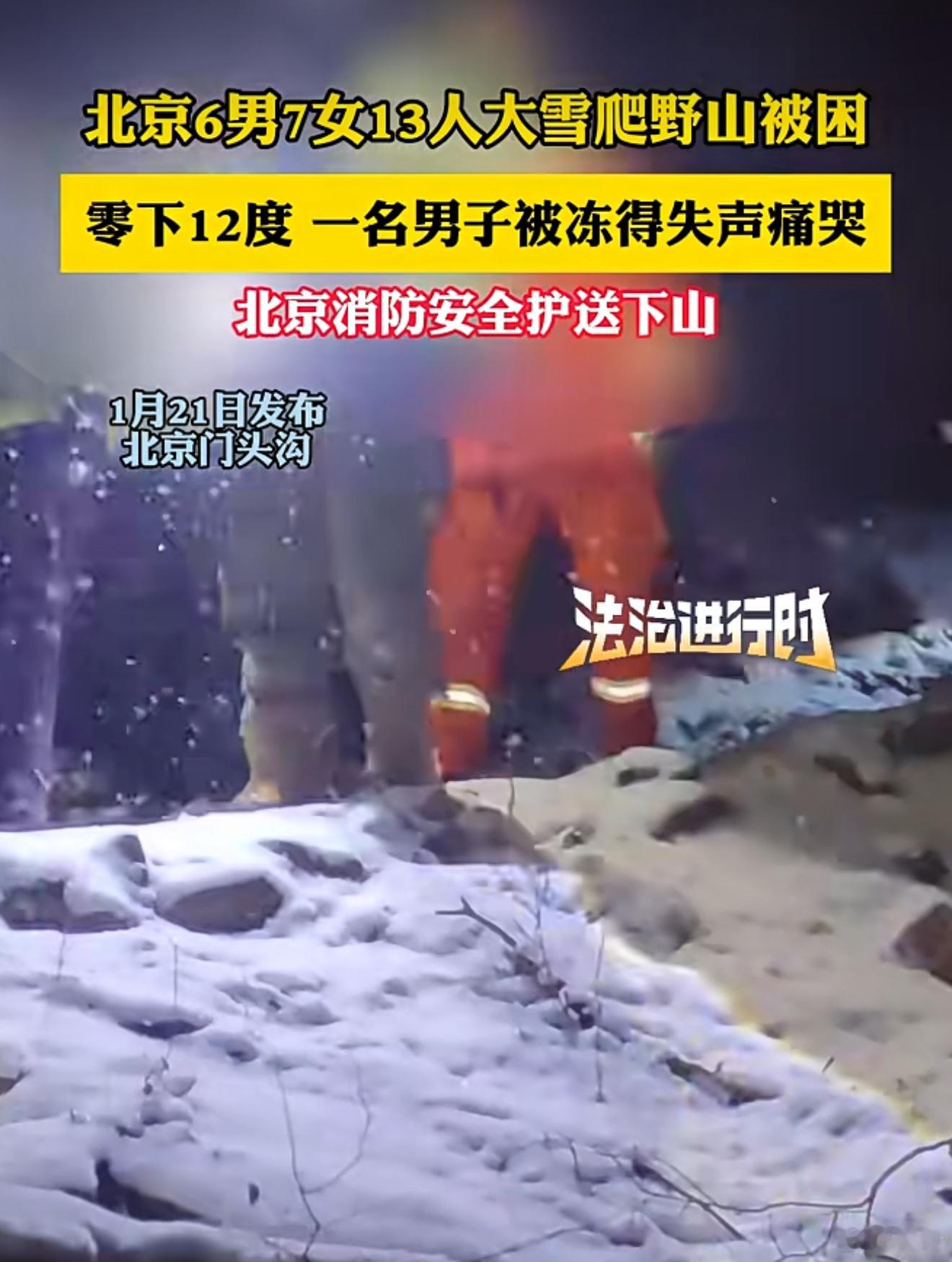 北京6男7女13人大雪爬野山被困,零下12度 一名男子被冻得失声痛哭,北京消防安全护送下山。大雪天去爬山干嘛?13人赶紧支付救援费