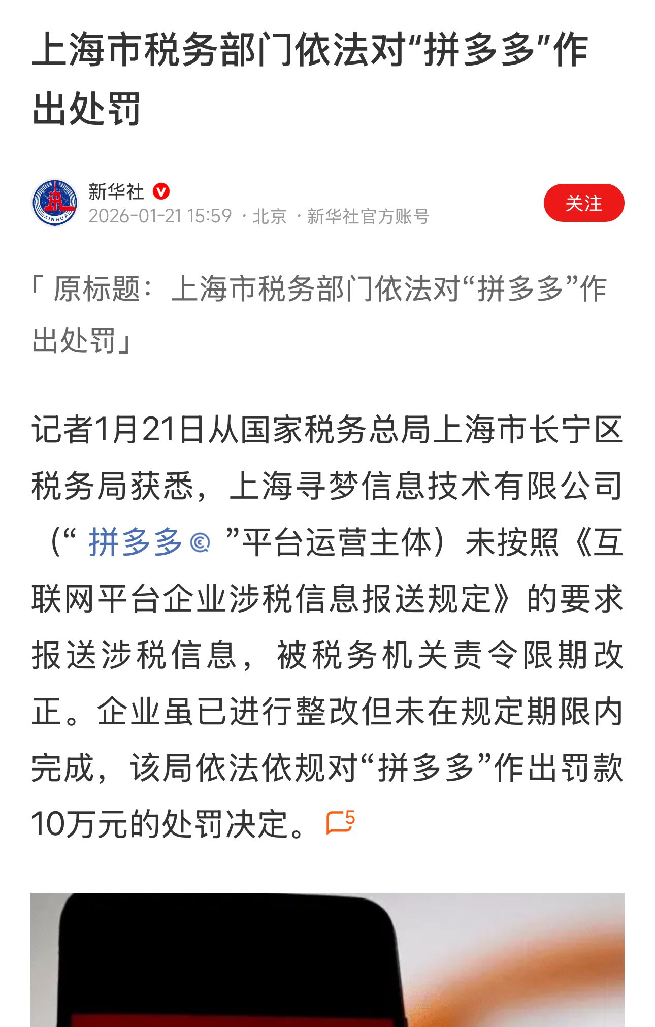 拼多多被税务部门处罚10万元近日一则关于拼多多被税务部门罚款的消息引发了广泛