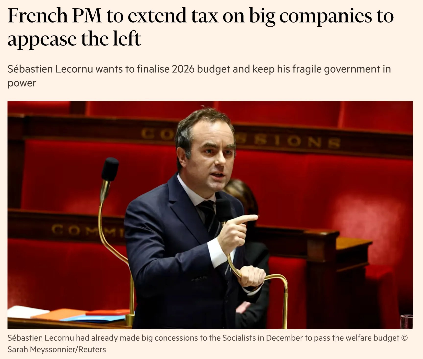 法国总理塞巴斯蒂安・勒科尔尼(Sébastien Lecornu)计划通过延长针对大型企业的征税政策,来换取左翼政党的政治支持,从而推进 2026 年国家预算的通过,并维持其脆弱政府的执政地位。对大企业加税是法国左翼政党的核心诉求之一,这类税收(类似 “巨富税” 或企业附加税)被左翼视为调节贫富差距、增加公共财政收入的关键手段。~~~~~~~~~~~~法国政府越来越左,财政赤字越来越多。为换取支持,勒科尔尼已放弃多项,原本用来压低赤字的措施,包括冻结非国防支出、取消退休族群税务优惠,转而增加更多的福利。资金来源,主要来自原本承诺只收一次的大型企业特别税续命,去年此税收进帐约 80 亿欧元,如今确定保留,但课税对象缩小到约 300 家最大企业。