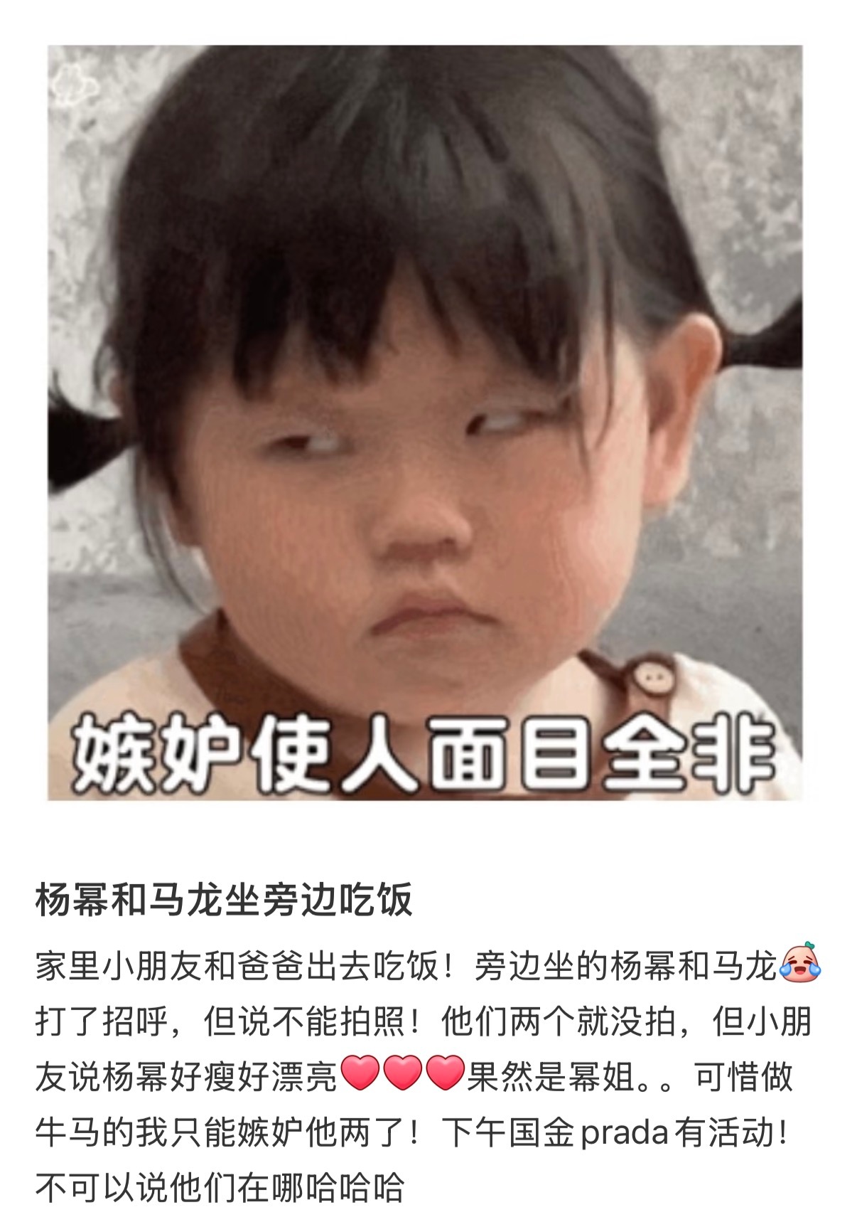 网友分享家人出门吃饭偶遇杨幂和马龙,还打了招呼可恶!还是大城市机会多!不说了我一点都不嫉妒!网友吃饭偶遇杨幂马龙杨幂和马龙坐旁边吃饭
