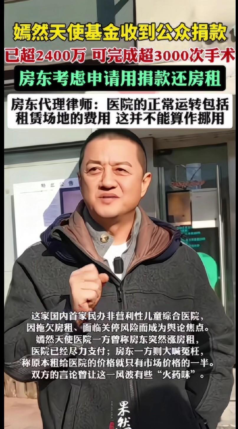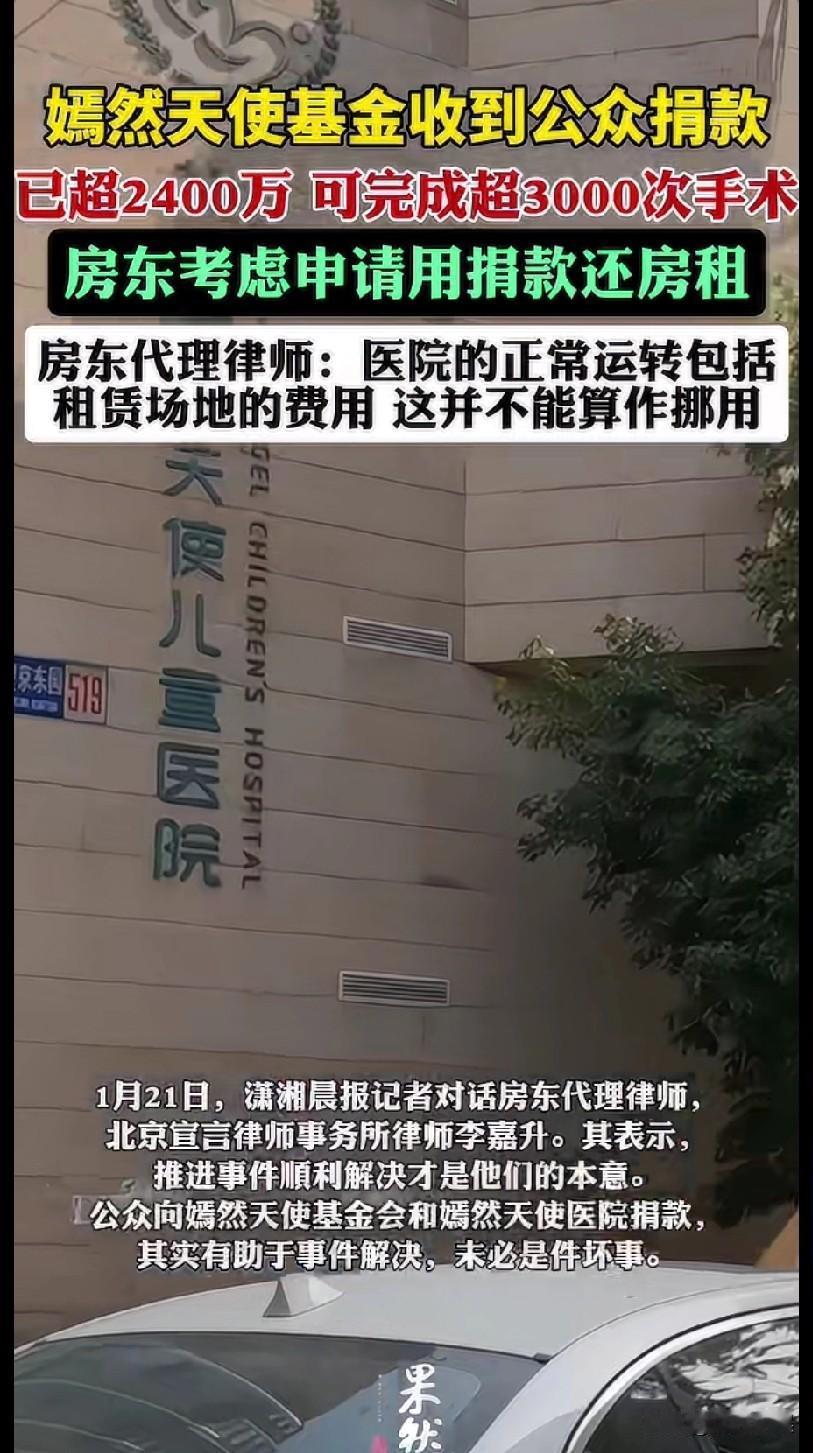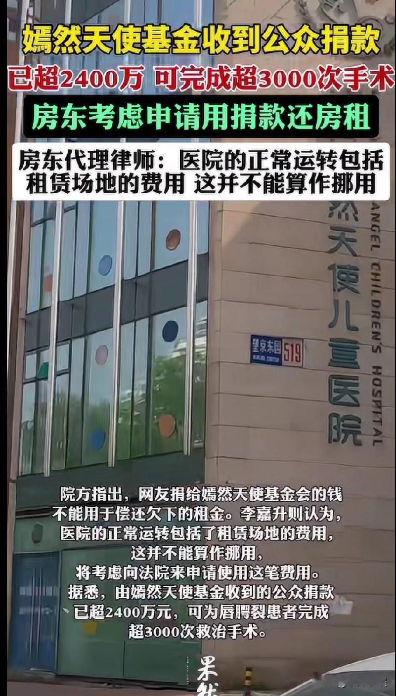 嫣然医院房东想要申请用民众的捐款还房租。 因为嫣然医院房东涨房租,嫣然医院欠了房租有3000多万元,现嫣然医院经营困难,无法运转。 这件事在网上流传后,网友们开始纷纷的为医院捐款,嫣然基金累计收到的捐款数额不断增加,现已达到了2400多万元。 院方表示,网友捐给嫣然基金会的钱,可以为唇腭裂患者完成超3000次的救治手术,这笔钱不能用于偿还欠下的租金,。 但是房东的代理律师表示,将要像法院申请使用这些捐款,用这些笔捐款还房租,该律师认为不算挪用,因为医院的正常运转包括了租赁场地的费用。 听着房东律师的发言也有道理,但是我觉得网友们捐款的目的,更多是想帮助唇腭裂患者,帮助李亚鹏能把医院继续运转起来,如果都去支付了涨的房租,那么既得利益者变为了房东。 嫣然天使公益 嫣然儿童医院 嫣然出名 公益嫣然基金 嫣然天使 嫣然天使儿童院 嫣然天使童医院