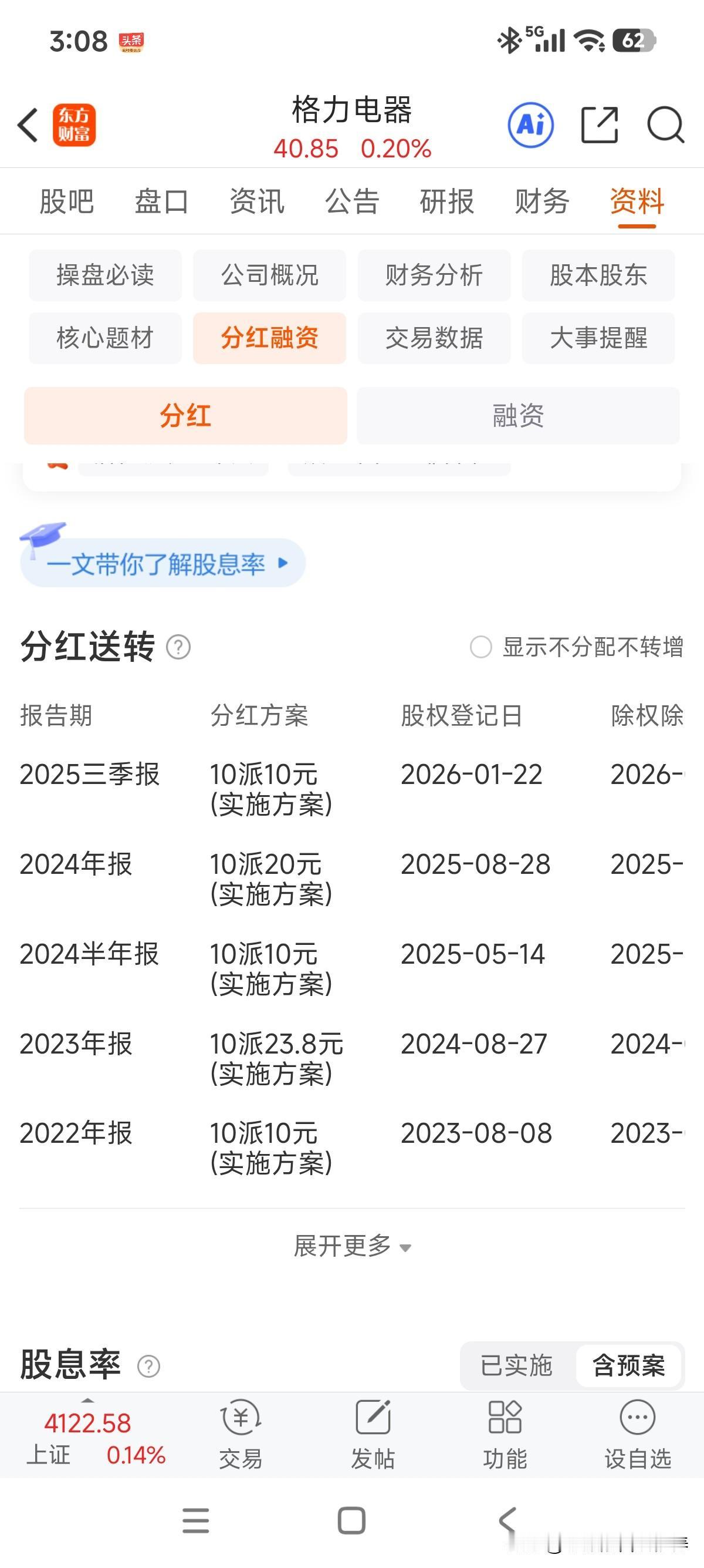 今晚股息就能到账户了!明天开盘除权,对比最近各红利股被批量按地上摩擦来说,格力电器稳得一批! 除权前还是保住了40元以上的价位,40元价位小区间震荡快5个月了!边收股息边等待区间突破! 除权后市盈率在7倍以上,股息率高达7.5%以上!