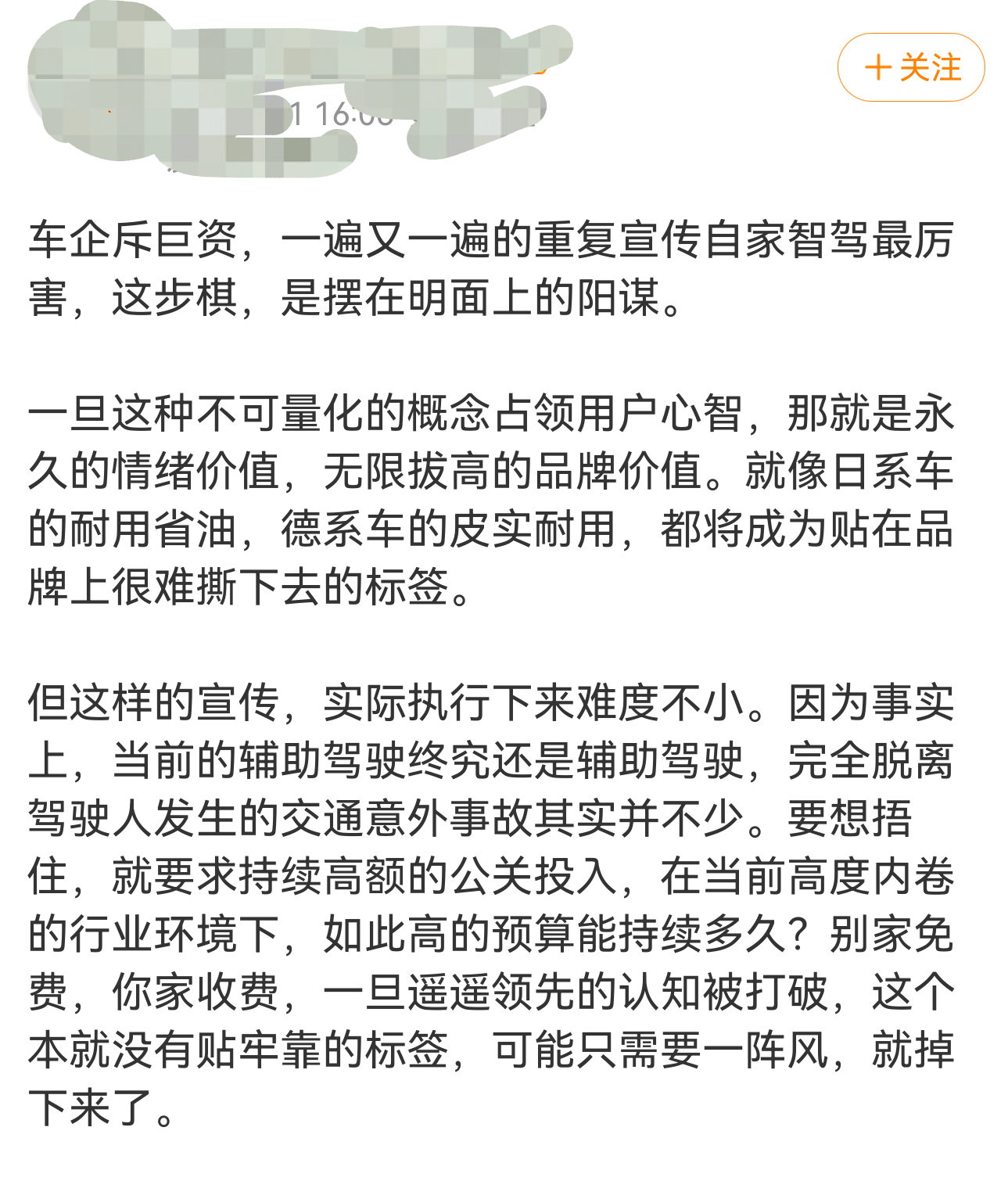 只需要营销,不需要技术投入吗?长期宣传辅助驾驶的车企,每一个都有大量的技术投入,并且有不错的体验。那些张嘴第一梯队,一上路就串稀的,宣传一两次就闭嘴了。