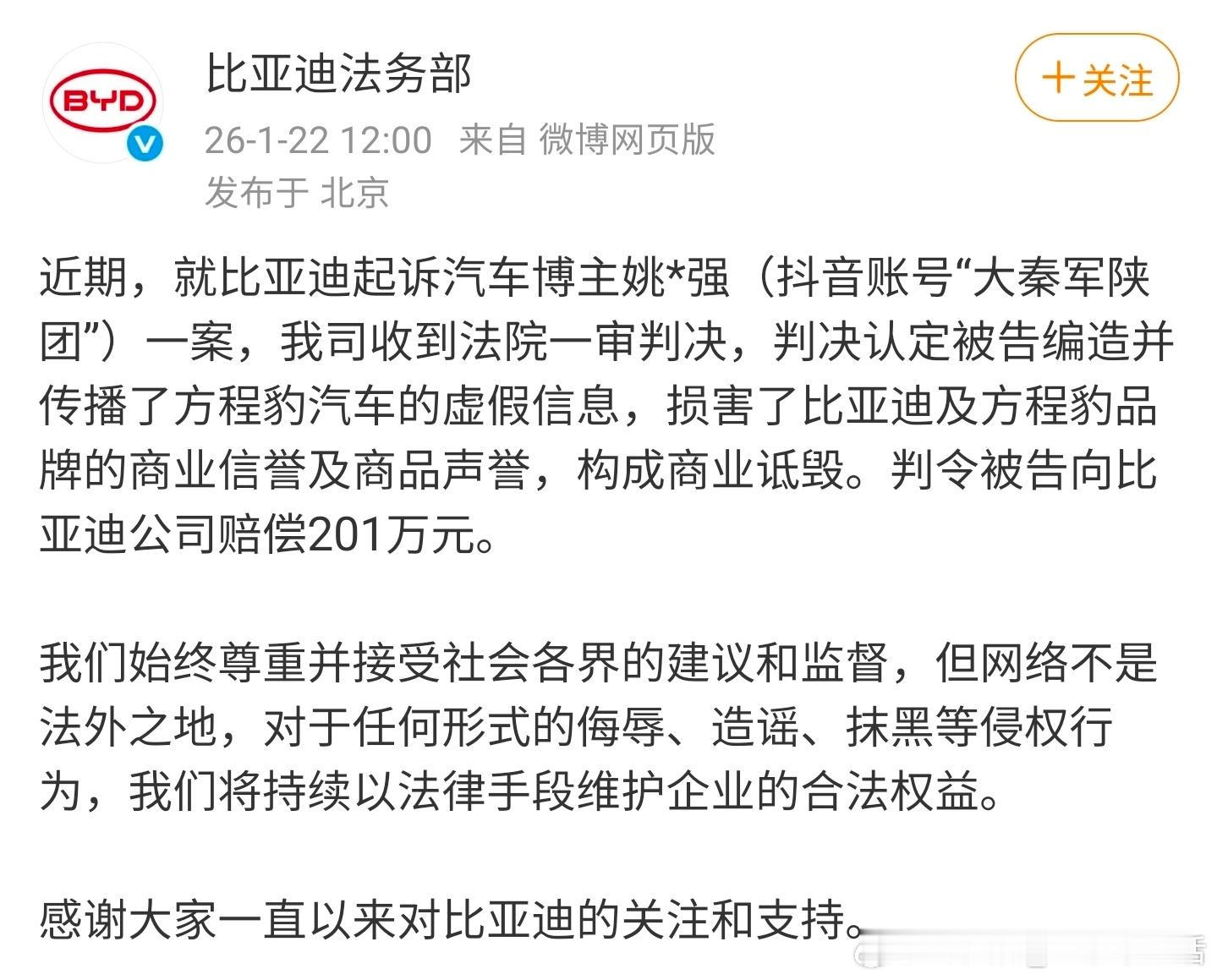 网络不是法外之地,支持法院的公正判决比亚迪