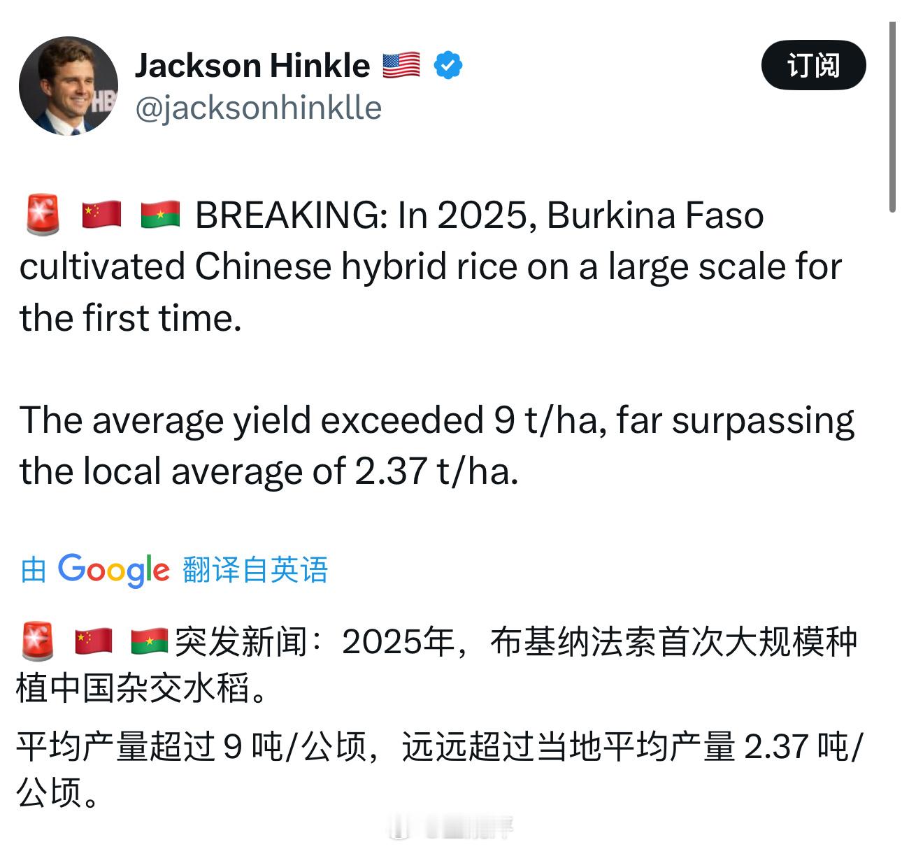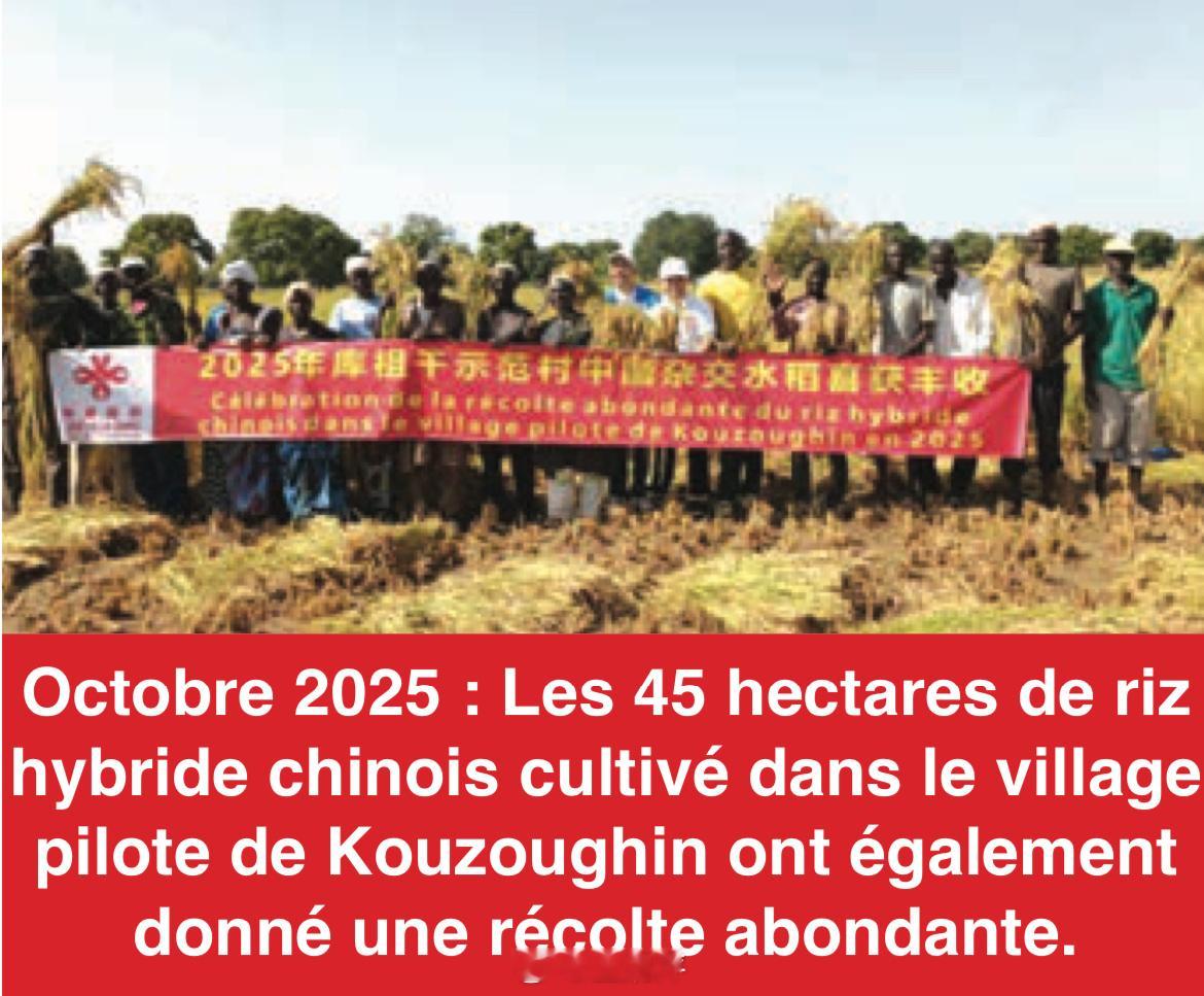 说中国🇨🇳的杂交水稻🌾帮助布基纳法索🇧🇫将粮食单产从2.37吨提升到9吨。查了一下资料,大体上是正确的,但我想略加修改。1️⃣布基纳法索🇧🇫位于撒哈拉沙漠南部,光照条件良好,农业劳动力充足,但受制于农业技术、良种、机械等原因,一度有60%粮食需要进口。中国从2018年开始就在农业技术上援助布基纳法索;2️⃣目前中国援助项目已经完成了三期,得益于中国专家的持续努力,布基纳法索已新开垦出2400公顷低地稻田、开始种植3种中国杂交水稻新品种,并完成了10个小型灌溉项目,农业技术培训班累计培训6841人;3️⃣在农业水利方面,除了常规的大水井、修水库外,中国专家还带来了太阳能抽水井这一新装置,不仅保证了当地农业用水,还能为人畜提供饮水;4️⃣2025年10月,布基纳法索Kouzoughin和Naliou两个村子的50公顷稻田均取得了丰收,每公顷产量达到9吨;5️⃣当然,长期素食是不行的,中国还在畜牧业方面提供援助,例如照片中就有给当地农民赠送优质雏鸡,能下蛋也能吃肉;6️⃣Bonjour,正人君子之国