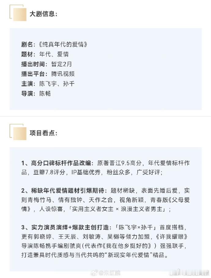 纯真年代的爱情开启招商,陈飞宇孙千新剧招商备受合作方关注,剧集摒弃工业糖精,用柴米油盐的日常勾勒出最纯粹的年代爱情模样。纯真年代的爱情开启招商陈飞宇孙千新剧招商