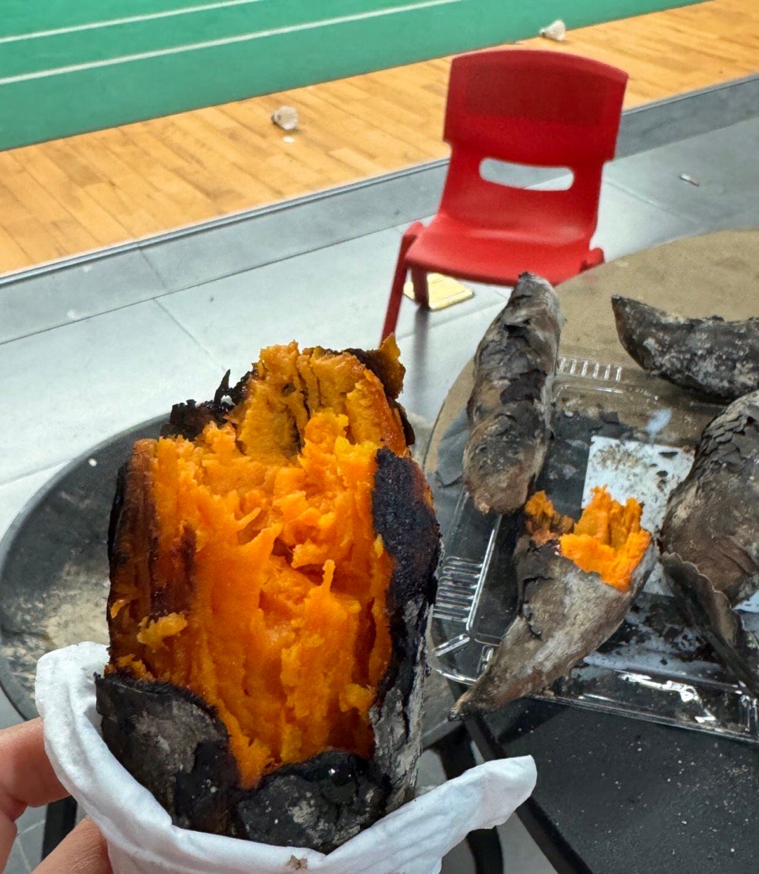在打一种很暖胃的球没想到在冰冷的球场也能吃上暖呼呼的红薯热乎的食物加上严防死守的