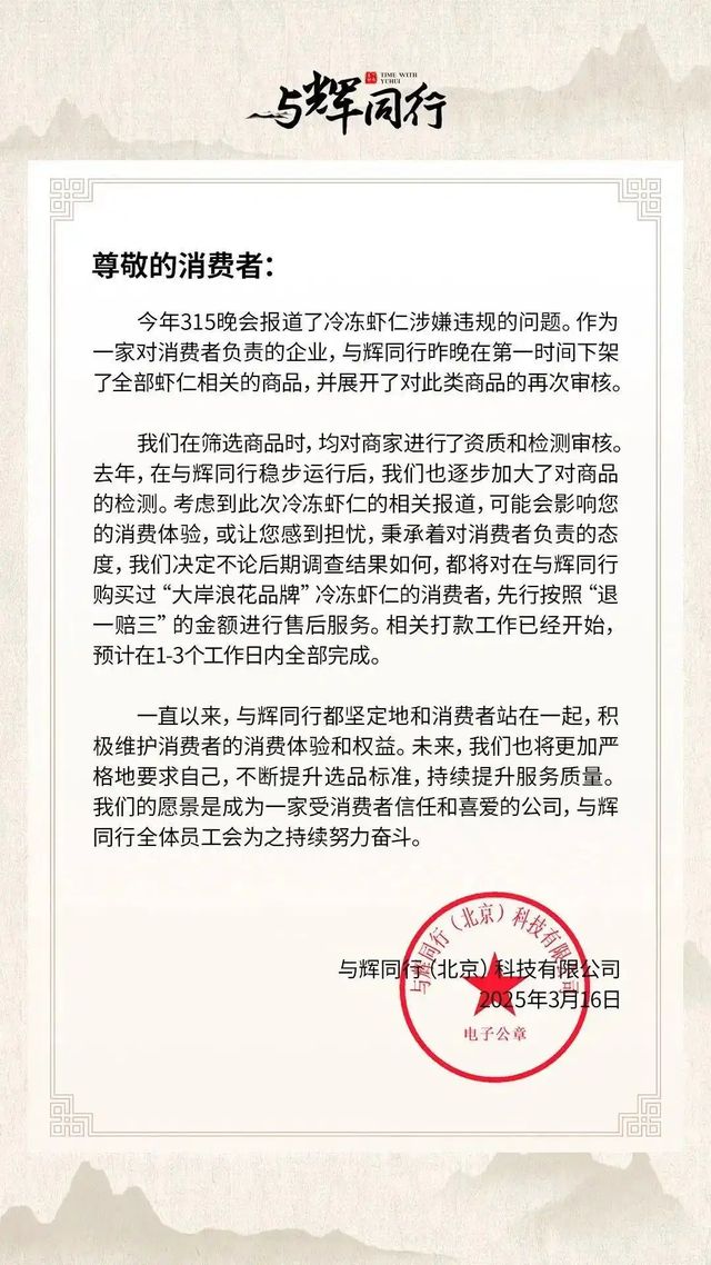 去年315期间,董宇辉再次卷入被曝光的冷冻虾仁风波中,与辉同行迅速发布声明,下架所有虾仁类商品并展开二次审核,启动“退一赔三”标准。