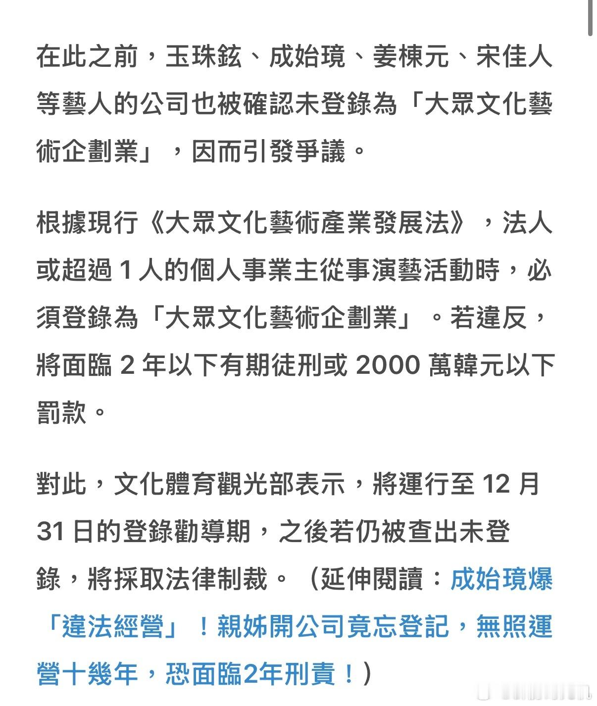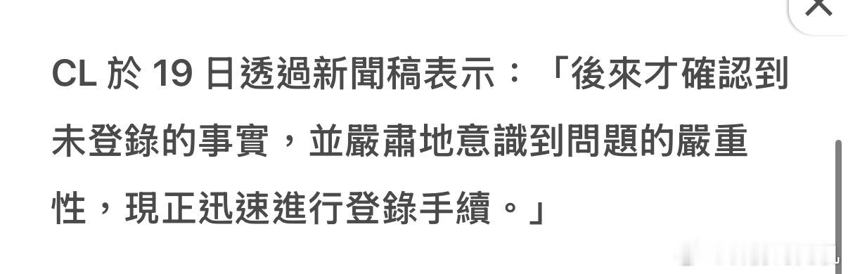 CL涉嫌非法运营 据韩媒,2NE1成员CL所属经纪公司涉嫌未注册,被以不拘留的形式移送检方。CL被移交检方据悉,CL于2020年2月设立1人企划社后,未曾在辖区主管部门完成大众文化艺术企划从业注册,以未注册的状态运营了5年7个月。同时,姜栋元所属事务所代表A某也承认于2023年1月设立法人后,2年9个月期间以未注册的状态运营,姜栋元因没有参与公司的运营和管理,因此没有嫌疑。(图1、图2)🚪另,2025年9月,韩媒就曝出CL未曾在辖区主管部门完成大众文化艺术企划从业注册。当时CL回应“后来才确认到未登陆的事实,并严肃地意识到问题的严重性,现正迅速进行登录手续”
