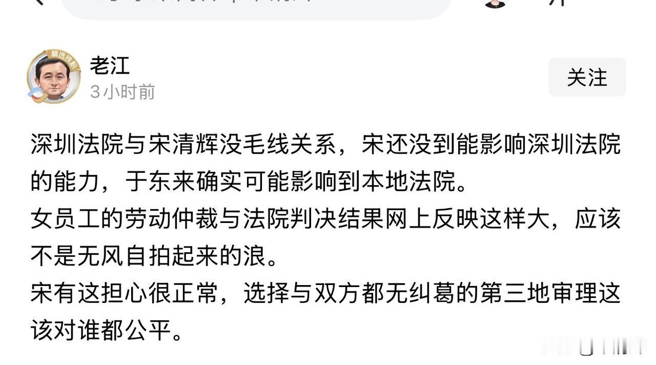深圳法院与宋清辉没毛线关系,宋还没到能影响深圳法院的能力,于东来确实可能影响到本地法院。 女员工的劳动仲裁与法院判决结果网上反映这样大,应该不是无风自拍起来的浪。 宋有这担心很正常,选择与双方都无纠葛的第三地审理这该对谁都公平。
