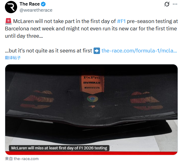 The Race:迈凯伦将不会参加1月26-30日巴塞罗那测试周的第一天,甚至可能直到第三天才会首次将新车驶上赛道。首先要说明的是,巴塞罗那季前测试周为期5天,但每支车队最多只可以选择其中3天进行赛道测试。奥迪表示他们的目标是在测试周首日上午9点就准备就绪,并为测试周剩余时间保留尽可能多的灵活性,其他多支车队都将在巴塞罗那测试周之前完成发布新车或已经顺利完成了新车首航。但迈凯伦可能采取与其他大多车队不同的策略,领队斯特拉表示迈凯伦的计划正在按部就班地进行。斯特拉:“这就是赛车目前的进度,随后赛车将前往巴塞罗那进行赛道首航,这将在测试期间直接进行。我们计划在第二天或第三天开始测试,所以我们不会参加第一天的测试,我们希望给自己留出尽可能多的开发时间。”“这始终是我们的 A 计划,则变动如此之大,我们不一定非要成为第一个上赛道的车队。我们希望为研发留出尽可能多的时间,因为每一天的研发、每一天的设计,都能增加一点性能。如果你早早走上赛道,你就能尽早获得所需的反馈,从而感到安心。但与此同时,这意味着你可能相对较早地就确定了赛车的设计和实现方案,因此你会在研发时间和最终性能之间做出妥协。显然,从测试到第一场比赛之间,几乎每辆赛车都会有更新。但我们认为,从整个赛季来看,以最具竞争力的套件和配置来启动并发布赛车至关重要。”“这就是为什么我们将所有时间节点都推向了极限,但仍处于一个非常可控的范围内。我们并不觉得有必要非得计划参加第一天的测试。”F1