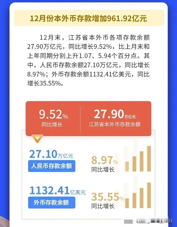江苏人在2025年底人均存款15.6万元,这一数据较2024年底的13.99万元,多了1.6万元。 这一数据是根据人民银行江苏分行公布数据来计算得来的。截至2025年底,江苏省全省本外币存款余额为27.9万亿,而居民部门的存款占了13.3万亿。 拿居民部门的存款量除以江苏常住人口数量,就可以得到人均数据。但是这个人均其实并没有太多微观价值,原因很简单,财富的分配差异巨大,也就是贫富差距依然较大。