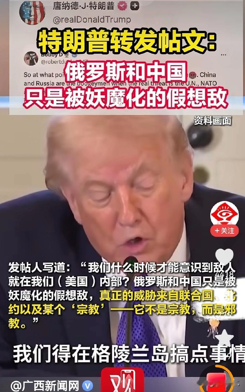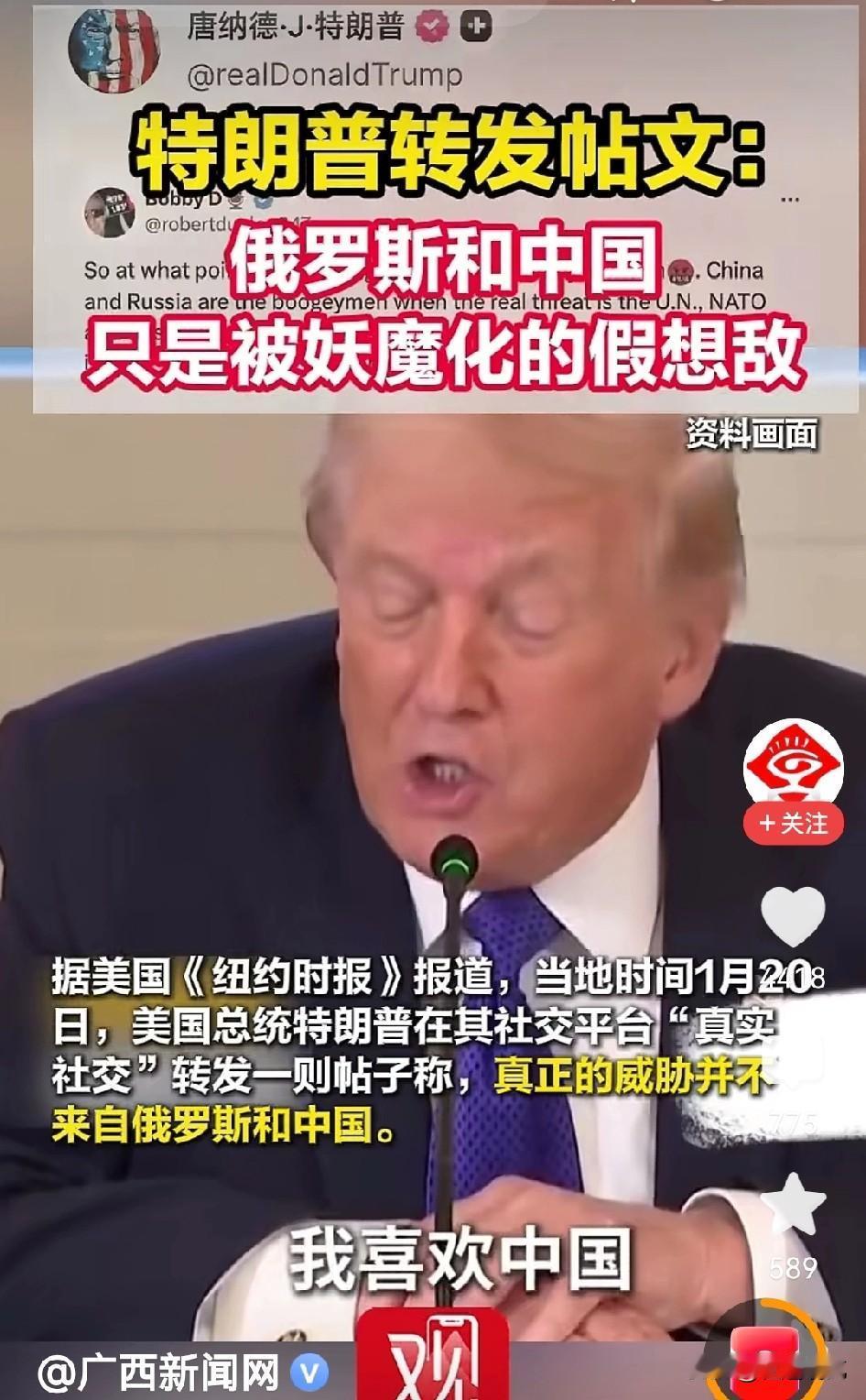 中国网友的智慧真是博大精深, 1月20日,特朗普发文“真正的威胁并不是俄罗斯和中国”,这似乎颠覆了大家对特朗普此前的印象。 但是他又提到在格陵兰岛上,并不想和俄罗斯和中国做邻居,因此必须先下手为强。 有网友指出,这不就是明修栈道暗度陈仓吗?在明面上稳住俄罗斯和中国,其实正加紧战略布局。 如果真像这位网友所说,那么大家都应该做好准备,说不定美国下一步又会用什么招。