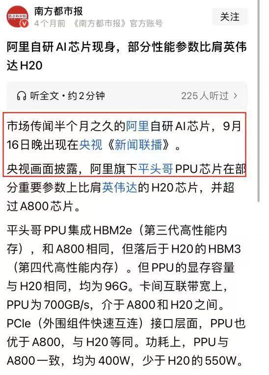 阿里巴巴雪藏8年“核武器”曝光,曾经还登上央视《新闻联播》? 日前,据接近市场人士称,阿里巴巴集团已决定支持旗下芯片公司平头哥未来独立上市。 平头哥是阿里旗下行业顶尖的芯片企业,成立时间已经有8年,但是因为一直非常低调,所以圈外人对它了解不多。 不过,平头哥虽然在圈外“名声不显”,但绝对是阿里隐藏的“大杀器”,在国产AI芯片中妥妥第一梯队的存在。 事实上,细心的朋友会发现,早在几个月前的央企《新闻联播》中,提到国产芯片公司时,平头哥就已经出现在了报道中。 当时在央视报道中,展示的是平头哥自研的一款名为PPU的GPU芯片,其核心参数是96GB的HBM2e显存,700GB/s的片间互联带宽以及PCIe 5.0×16的接口,整体功耗仅为400w。 这样的性能已经远超英伟达的A800和主流国产GPU,能够和英伟达的H20媲美了。 当时这一幕还在网上引起了热议,网友纷纷疑惑,能够登上央企,拥有这么强性能芯片的平头哥到底是哪家公司,如今很多人才反应过来,原来是阿里的。只能说阿里藏的太深了。 值得一提的是,随着雪藏了8年的平头哥正式“出山”,对于行业而言也必然意义非凡,这意味着阿里从AI芯片、云计算、大模型到AI应用的全栈布局已经彻底完成。 而纵观全球,目前能够有这一能力的,除了阿里也就只有一个谷歌,“阿谷AI两极化”的局面正在全球形成,以后西方看谷歌,东方看阿里真不是一句玩笑话了!