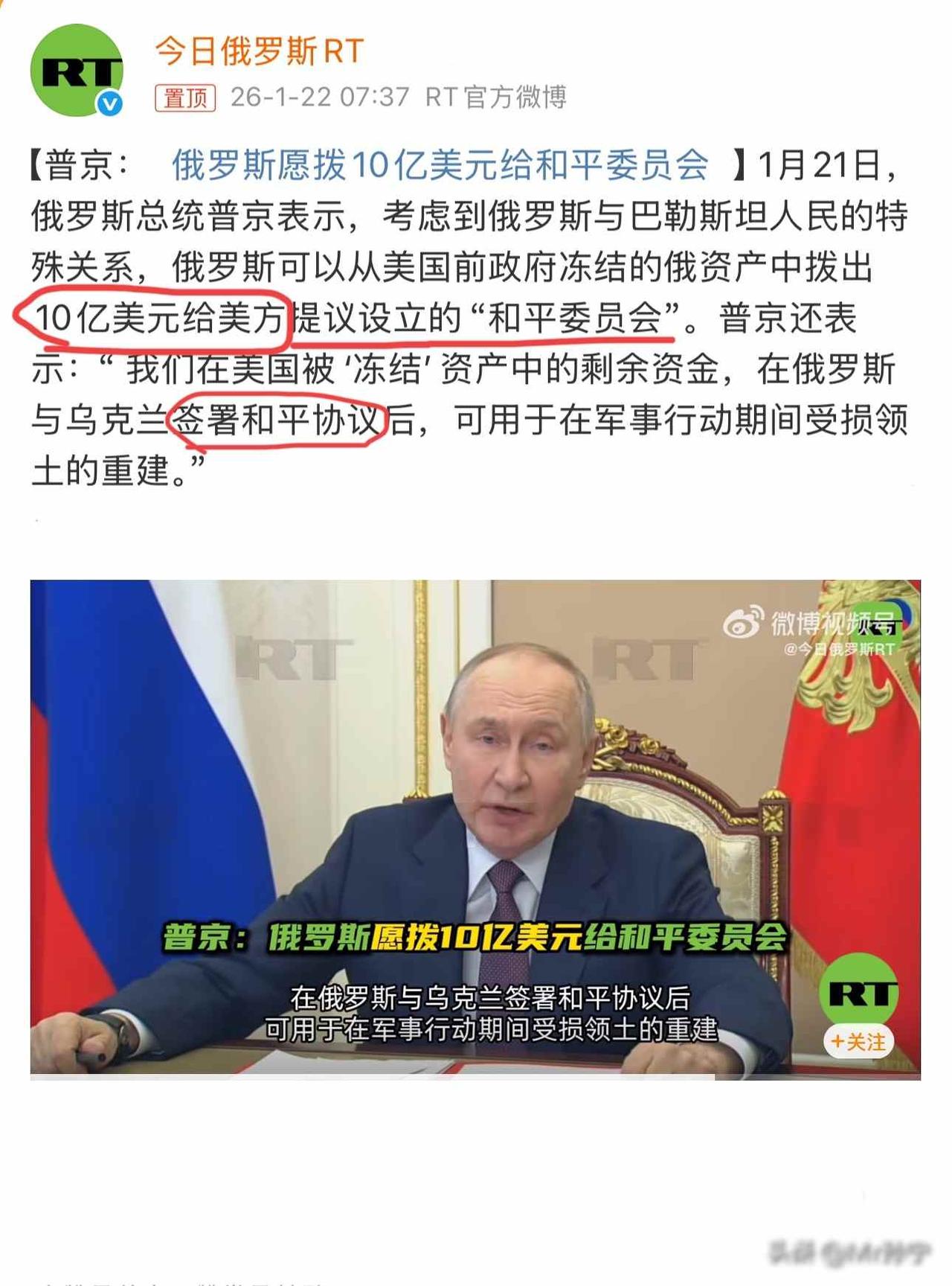 欧洲冻结俄资产,俄转捐美方,和平信号真伪难辨? 2026年1月21日,欧洲方面突然动手,冻结了俄罗斯政府以及官员在欧洲的财产,还提出要没收这些资产,这件事情做得很绝,事先没有发出通知,也没有留下回旋的余地。 第二天,俄罗斯就做出一个大动作,宣布给美国主导的那个和平委员会捐出十亿美元,还公开表示愿意跟乌克兰签订和平协议,这个举动来得太突然,毕竟俄罗斯和乌克兰已经打了将近四年仗,中间连像样的谈判都没有出现过,更别说俄罗斯方面主动提出和谈这件事。 最让人摸不着头脑的是,这次俄方没有提出任何条件,也没有指责第三方多管闲事,以前他们动不动就拒绝别人调停,现在态度软得不像话,到底是真心想要停止冲突,还是暗地里打着别的主意,没有人能够确定。 这波操作,到底是拿出真心,还是拖延时间,你觉得呢? 俄乌冲突 和平协议