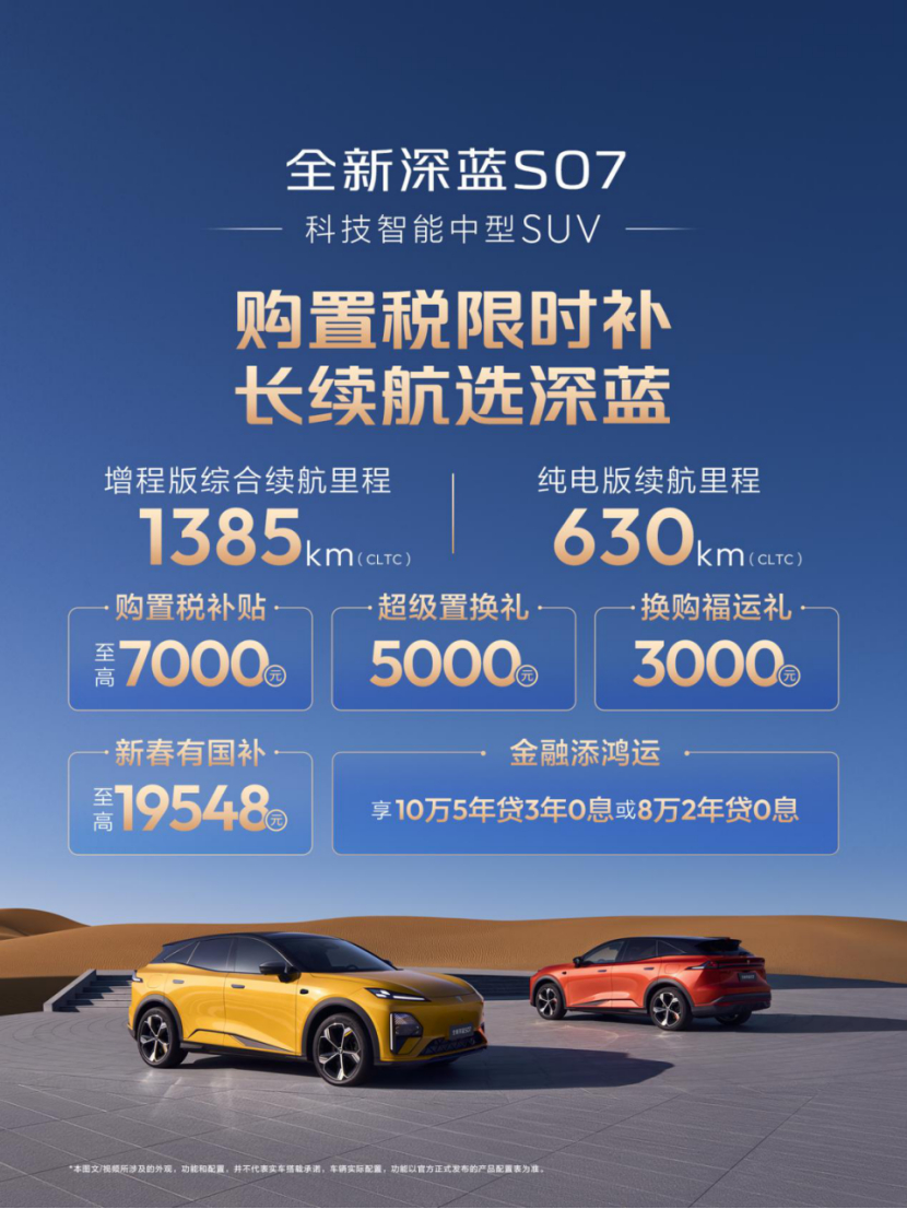 快过年了,相信有很多朋友过年回老家都想开着新车,要我说,2026年春节买新车,必须要买既全能又实用的车帮大家看过了,15万价位段的深蓝S07就是个很好的选择,它既有灵敏的操控,聪明的华为乾崑ADS SE智驾系统,还是辆长续航带快充的SUV咱们直接说重点,深蓝S07这辆车本身的综合素质就非常强。先说续航,因为我是一个东北人,常年在北方生活,冬天电车续航很容易有衰减。恰好这辆车就主打长续航,纯电版本就有630km的续航里程,还带3C快充。在高速上跑没电了,到服务区充个15分钟就能接着跑,不耽误功夫。或者实在是有续航焦虑,还可以选择1385km的增程长续航版本,这两种能源形式也都支持脉冲加热技术,冬天就放心开吧!跑长途自驾、日常通勤出门,我最偏爱这车的一点,就是全系标配华为乾崑ADS智能辅助驾驶!跑高速开NOA,跨省自驾不用一直紧绷着踩油门刹车,解放手脚一路轻松;早晚高峰城区跟车,遇上堵车也不用频繁启停,通勤路上少点烦躁;逛商场、进小区遇上窄车位、斜车位,智能泊车一键搞定,再也不用反复挪车半天;就连日常接送娃、买菜路上,碰到前车急刹、行人横穿这些突发情况,全场景防碰撞也能及时反应,不管是长途出行还是日常代步,方方面面都考虑到了,真的太省心了对了,差点忘了说,现在赶上全新深蓝S07新春补贴限时抢,从购置税补贴到金融政策,优惠力度挺大,最高能省两万多。那朋友们,就这样一款极尽全能的SUV,过年开回家不?