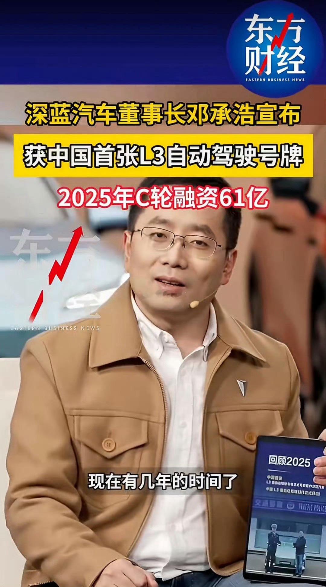 深蓝获中国首张L3自动驾驶正式号牌邓承浩回应深蓝汽车获61亿融资 邓承浩称融资是发展起点,深蓝斩获L3合规牌照,加速智驾技术商业化落地