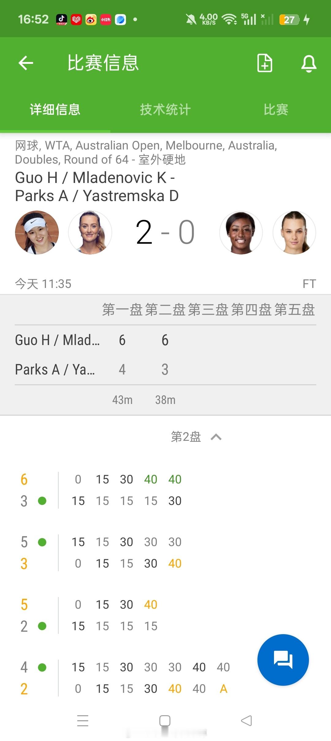 小花小草资讯 【2026澳网】女双第一轮郭涵煜🇨🇳/梅拉德诺维奇🇫🇷 6-46-3击败帕克斯🇺🇸/雅斯特雷姆斯卡🇺🇦晋级第二轮郭梅组合收获5连胜收获130分双打即时排名24(-1)