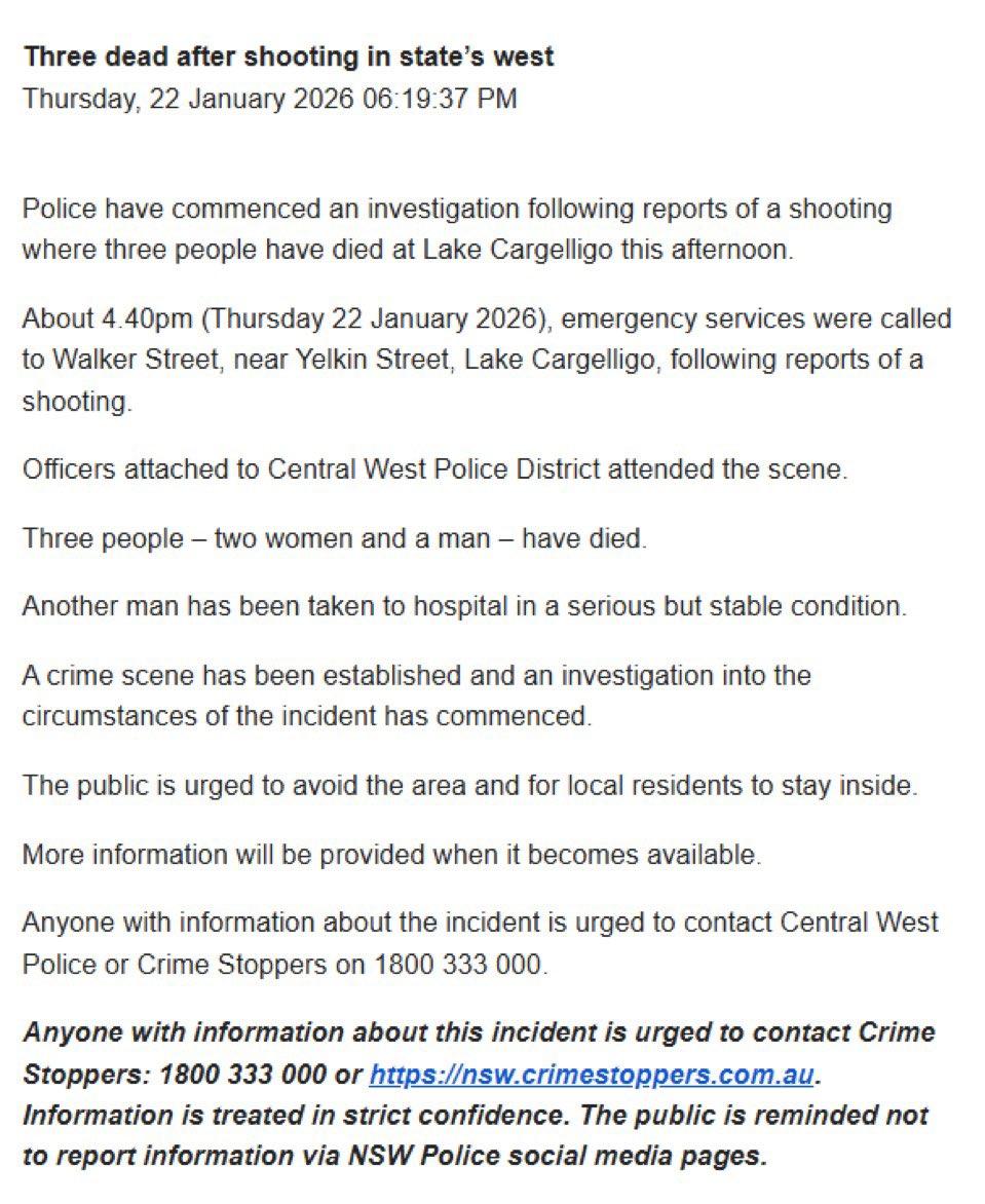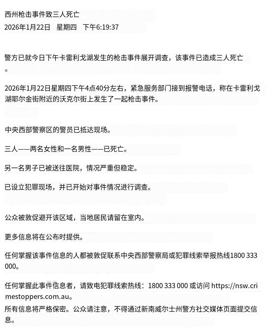 突发新闻—— 澳大利亚莱克卡杰利戈(Lake Cargelligo)发生枪击事件,至少3人死亡,1人重伤。嫌疑人目前仍在逃,警方已要求该镇居民留在室内,避免外出。目前尚未公布任何作案动机。(事件发生在2026年1月22日,新南威尔士州偏远小镇Lake Cargelligo,人口约1500人。警方确认两名女性和一名男性遇难,一名男性伤者被送往医院,情况严重但稳定。枪击发生在两个地点,涉及熟人关系。嫌疑人持有长枪,警方已知其身份,正在大规模搜捕中。部分媒体报道称可能与家庭暴力/前伴侣纠纷有关,但警方尚未正式确认动机。居民收到紧急手机警报,当地气氛紧张。)如有最新进展,可关注新南威尔士州警方官方声明或澳大利亚主流媒体(ABC、SMH等)。向受害者及其家属表示哀悼,也希望当地社区平安。