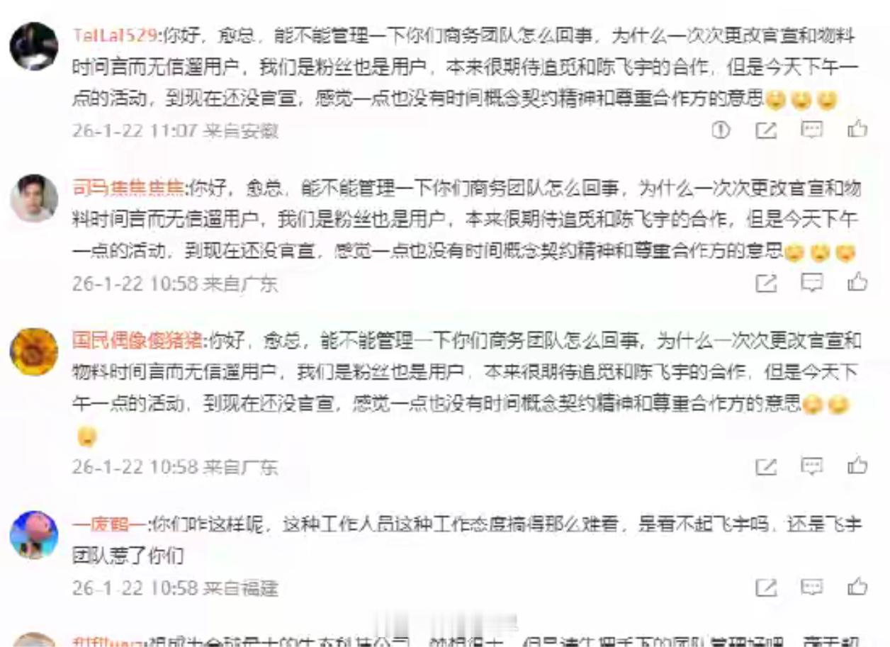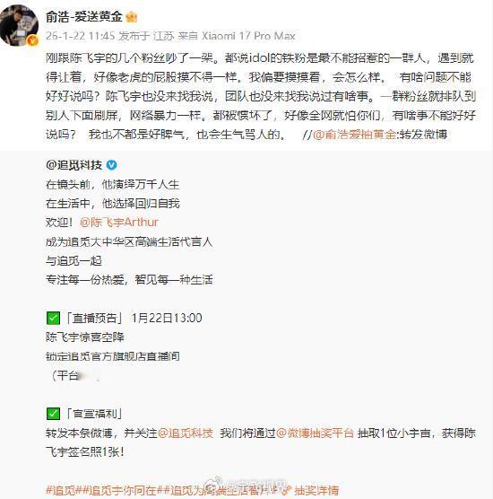 追觅CEO俞浩怒怼陈飞宇粉丝事件回顾:一条微博引发的“战争”今天(1月22日)上午11点,追觅官宣陈飞宇为品牌代言人,原本是场双赢的合作,却因官宣时间变更炸了锅。粉丝们直接冲进俞浩的微博评论区刷屏维权:“下午1点的活动,到现在还没官宣,毫无契约精神!”甚至有人质疑品牌“看不起飞宇”。而俞浩的回应::“到我这里刷屏,礼貌吗?”“你们才有问题呢!”:“回去转告你们的idol,让粉丝头子通知删留言!”升级矛盾:发微博称粉丝“被惯坏了”“像网络暴力”,还放话“我偏要摸摸老虎屁股”。粉丝觉得自己是用户,维权天经地义;老板觉得被“网络暴力”,不能惯着,技术型老板有个特点:信奉理性沟通,厌恶情绪绑架。