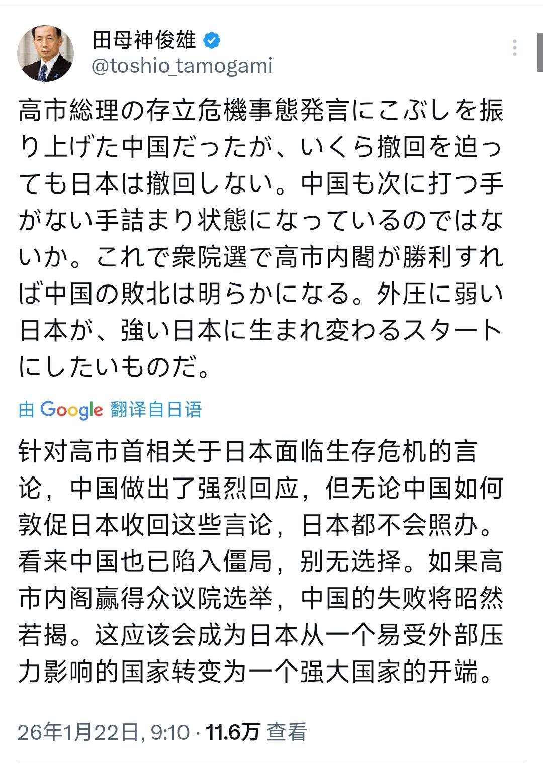太嚣张了!1月22日,日本日本航空自卫队前参谋长田母神俊雄发文叫嚣道:“针对高市首相关于日本面临生存危机的言论,中国做出了强烈回应,但无论中国如何敦促日本收回这些言论,日本都不会照办。看来中国也已陷入僵局,别无选择。如果高市内阁赢得众议院选举,中国的失败将昭然若揭。这应该会成为日本从一个易受外部压力影响的国家转变为一个强大国家的开端。” 说白了,田母神俊雄这番话,不是在尊重历史和国际关系准则,而是在公然挑衅和颠倒黑白! 说实话,这可能是为了给日本极右翼势力站台,迎合国内极端民族主义情绪,但他却将日本的利益和国际形象置于不顾,这种政治投机行为,严重破坏地区和平稳定。 要清楚,他的言论就像一颗 “定时炸弹”。看似能为极右翼势力鼓噪,提升所谓的 “民族士气”,但必将引发周边国家的强烈反感,让日本在国际社会更加孤立,损害日本自身的经济和外交利益。 并且,这种对历史和国际关系的错误认知会影响日本年轻一代的价值观,不利于培养和平意识和国际责任感,对地区的未来发展是潜在的威胁。 要清楚,历史上曾有国家因极端民族主义而走向战争和毁灭,就像二战时期的法西斯国家。这种行为模式具有普遍危害性,尊重历史、和平共处才是正道。 而未来有两条路:一是若日本极右翼势力继续得势,这种危险言论和行为会不断升级,导致日本与周边国家关系持续恶化,陷入外交困境;二是若日本民众能认清极右翼的危害,抵制这种错误思潮,日本还有机会回归正常外交轨道,修复与周边国家的关系。 说到底,田母神俊雄之流的言论就是一场危险的赌局,把日本的未来当作筹码。唯一的出路在于尊重历史事实、遵守国际法、与周边国家和平合作。 以上是小编个人看法,如果您也认同,麻烦点赞支持!有更好的见解也欢迎在评论区留言,方便大家一同探讨。