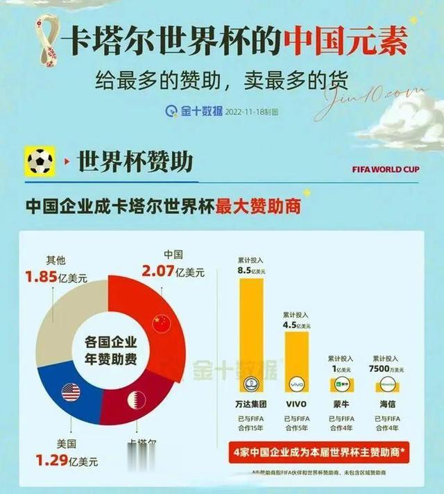 2022年卡塔尔世界杯,中国企业砸了13.95亿美元,超过了美国,成了最大的赞助商。