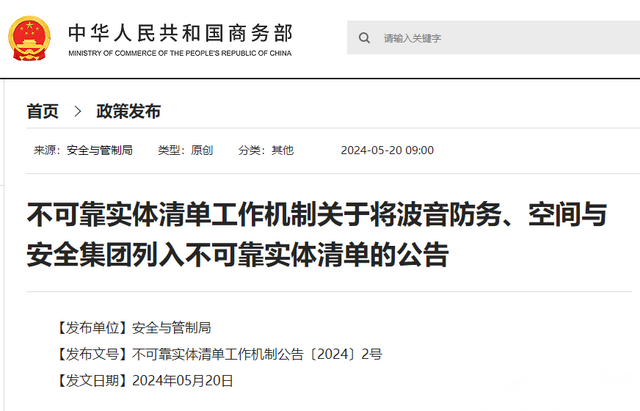 紧接着,在5月20日当天,商务部再次出手,将参与对台湾地区军售的美国波音防务、空间与安全集团(Boeing Defense, Space & Security)列入不可靠实体清单,并采取了一系列严厉的处理措施。这些措施包括禁止该企业从事与中国有关的进出口活动、禁止其在中国境内新增投资、禁止其高级管理人员入境、不批准并取消其高级管理人员在中国境内的工作许可、停留或居留资格,以及对其处以高额罚款。这些举措不仅体现了中方维护国家主权和安全的坚定立场,也向国际社会传递了一个明确的信息:任何企图干涉中国内政、损害中国利益的行为,都将受到严厉的反制。