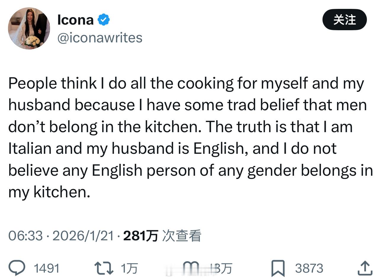 “人们以为我包揽家里一日三餐,是因为我抱着男人不该进厨房的老保观念。但其实事实是:我是意大利人,但我丈夫是个英国人。在我看来,任何英国人——无论男女——都没有资格进到我的厨房里。”