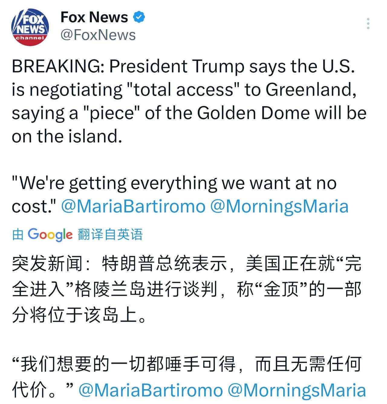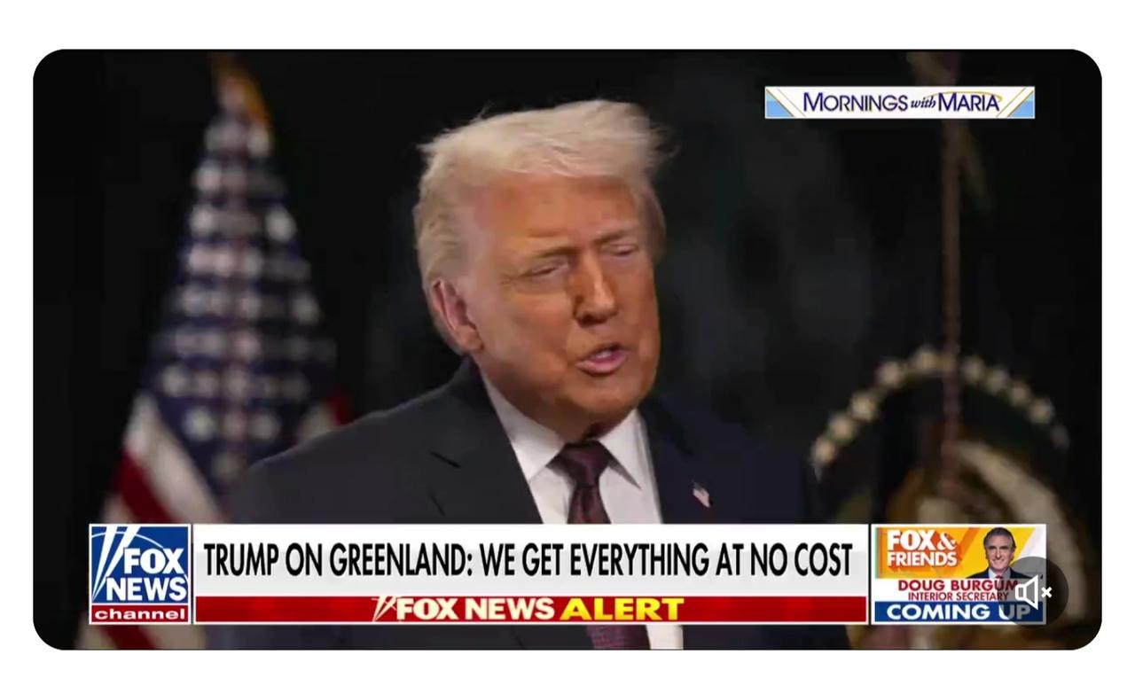 突发新闻:特朗普总统表示,美国正在就“完全进入”格陵兰岛进行谈判,称“金顶”的一部分将位于该岛上。 “我们想要的一切都唾手可得,而且无需任何代价。”