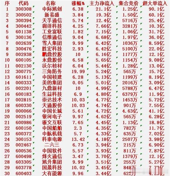 1月22日尾盘,主力资金“大幅抢筹的”30名单一览!中际旭创:净流入21.1亿元,超大单流入90.1亿元新易盛:净流入19.3亿元,超大单流入60.1亿元天孚通信:净流入12.4亿元,超大单流入25.4亿元润泽科技:净流入7.66亿元,超大单流入10.3亿元工业富联:净流入7.15亿元,超大单流入31.7亿元信维通信:净流入6.68亿元,超大单流入36.0亿元