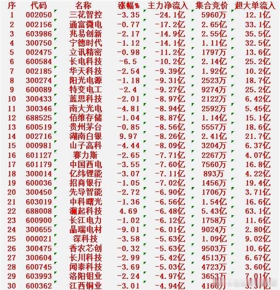 1月22日收盘,主力资金,已经大幅卖出的30名单:三花智控:净流出24.1亿元通富微电:净流出17.2亿元兆易创新:净流出14.9亿元宁德时代:净流出14.1亿元立讯精密:净流出11.2亿元长电科技:净流出10.2亿元华天科技:净流出9.39亿元阳光电源:净流出9.31亿元特变电工:净流出9.27亿元蓝思科技:净流出8.97亿元