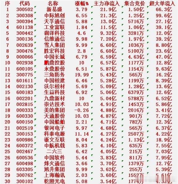 1月22日收盘,主力资金“大幅买入”的30名单:新易盛:净流入21.9亿元中际旭创:净流入21.3亿元天孚通信:净流入13.0亿元工业富联:净流入11.5亿元润泽科技:净流入9.32亿元信维通信:净流入7.20亿元雪人集团:净流入6.60亿元胜宏科技:净流入6.60亿元中国长城:净流入6.59亿元鹏鼎控股:净流入6.57亿元永鼎股份:净流入5.87亿元三角防务:净流入5.43亿元中国核建:净流入5.28亿元沃尔核材:净流入5.09亿元生益科技:净流入5.06亿元九鼎新材:净流入5.04亿元崇达技术:净流入4.91亿元美的集团:净流入4.88亿元天通股份:净流入4.87亿元中国船舶:净流入4.71亿元