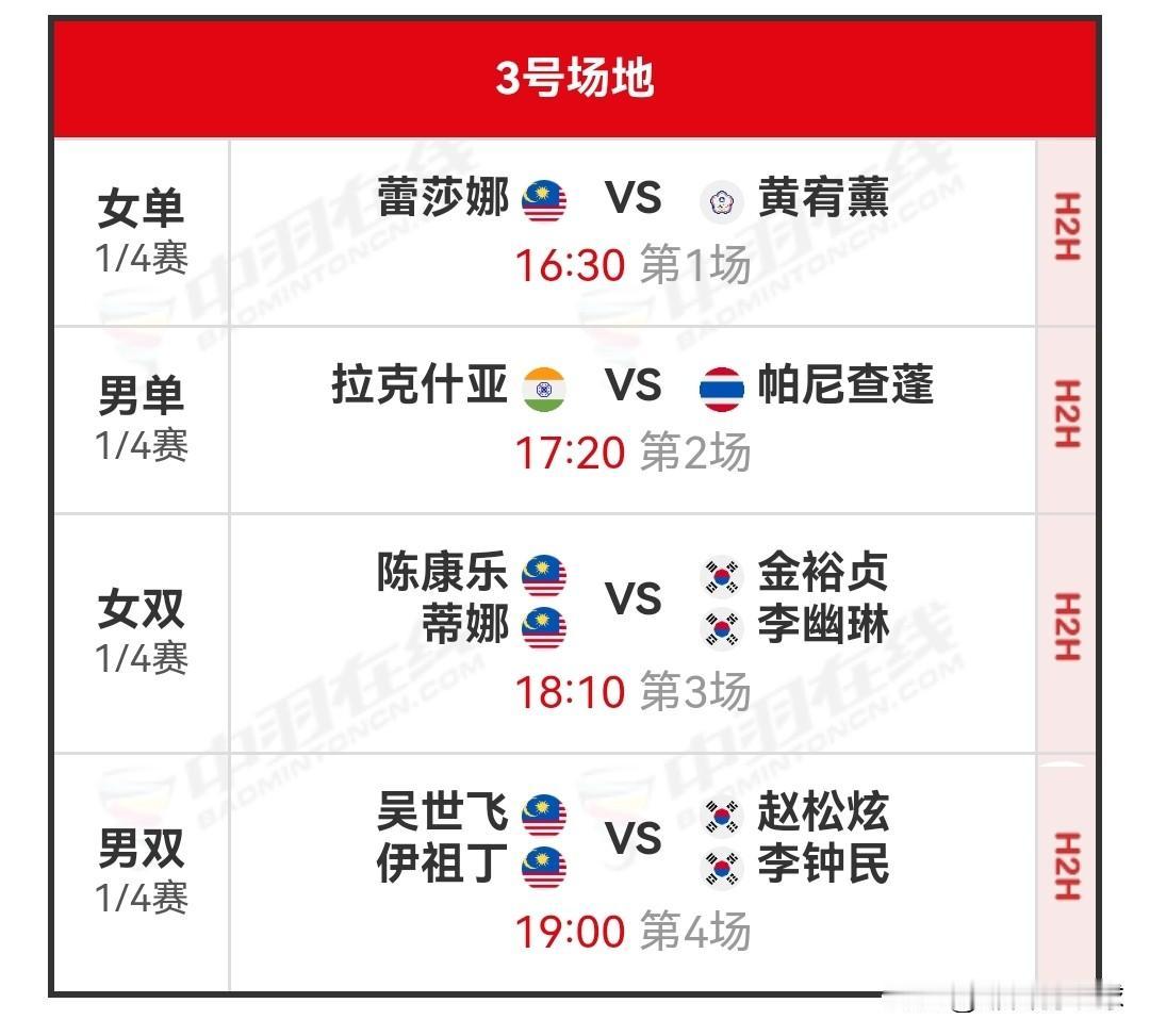 1月23日印尼羽毛球大师赛1/4决赛安排 今日国羽战况为4胜2负。罗徐敏/王漪朵轻松直落两局,击败中国香港的范嘉茵/尤漫莹;陈雨菲同样以两个局分横扫雅各布森;“酱板鸭”组合也直落两局战胜省队的陈政宽/许尹鏸;郭新娃/陈芳卉同样两局淘汰许邦荣/钟舒韵,他们均顺利晋级八强。 胡珂源/林祥毅激战两局,惜败跨国组合崔率圭/吴蔚昇;王正行大战三局,被法汉逆转淘汰。至此,国羽男单、男双全部出局。 明日1/4决赛,一、二场地于14:30开赛,三号场地16:30开赛。明日陈雨菲将对阵辛杜,郭新娃/陈芳卉将迎战马蒂亚斯/博尔。详细对阵安排如下: 羽毛球 羽毛球爱好者 羽毛球比赛 国羽赛程 羽毛球赛事 羽毛球赛程 陈雨菲 王正行