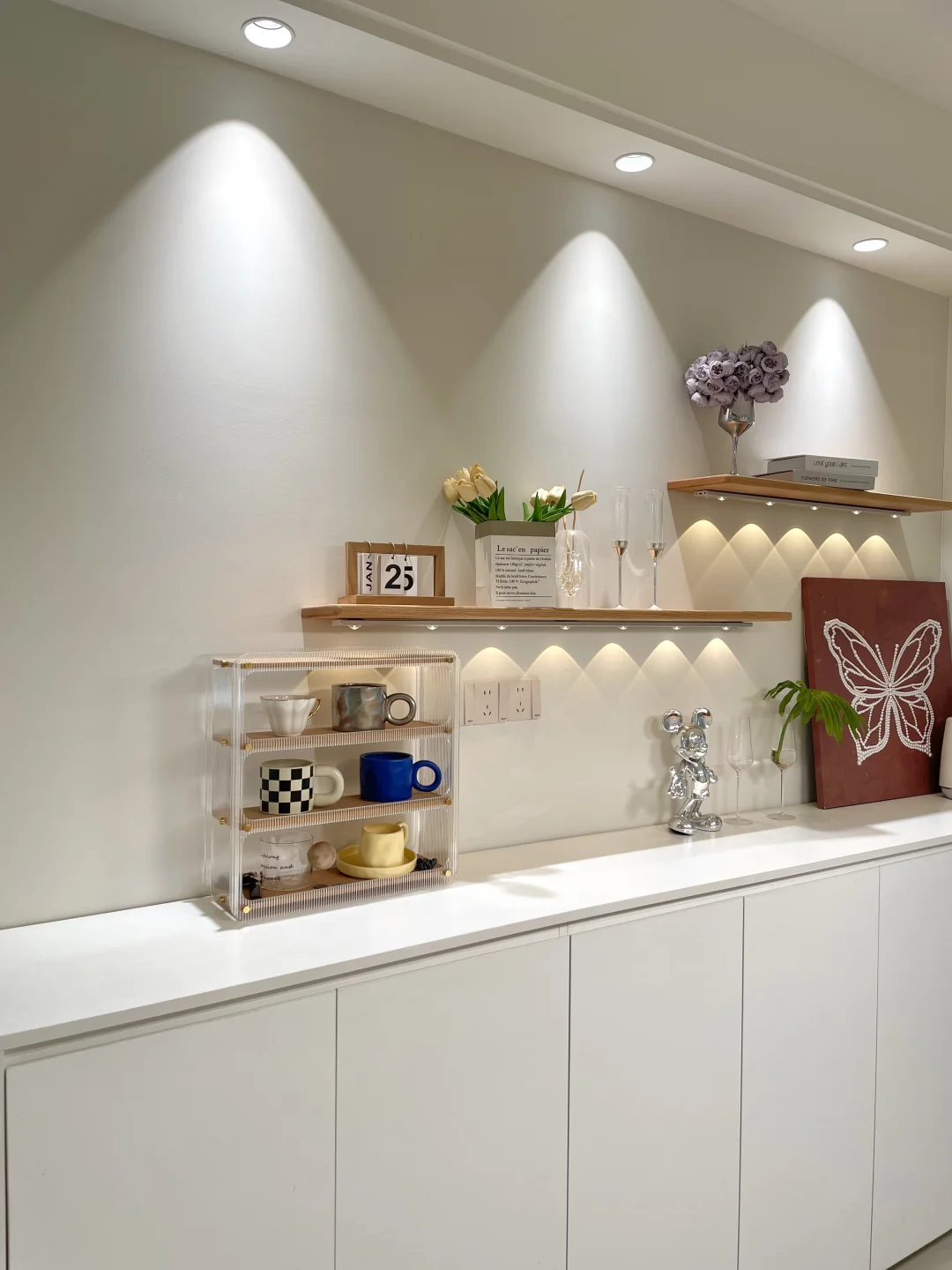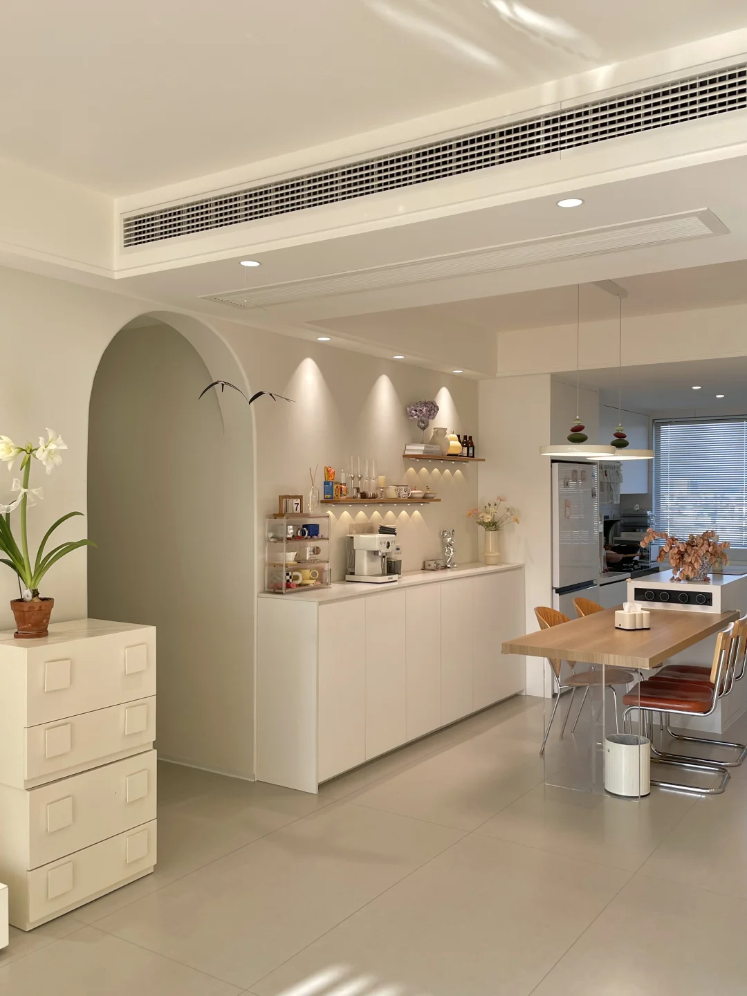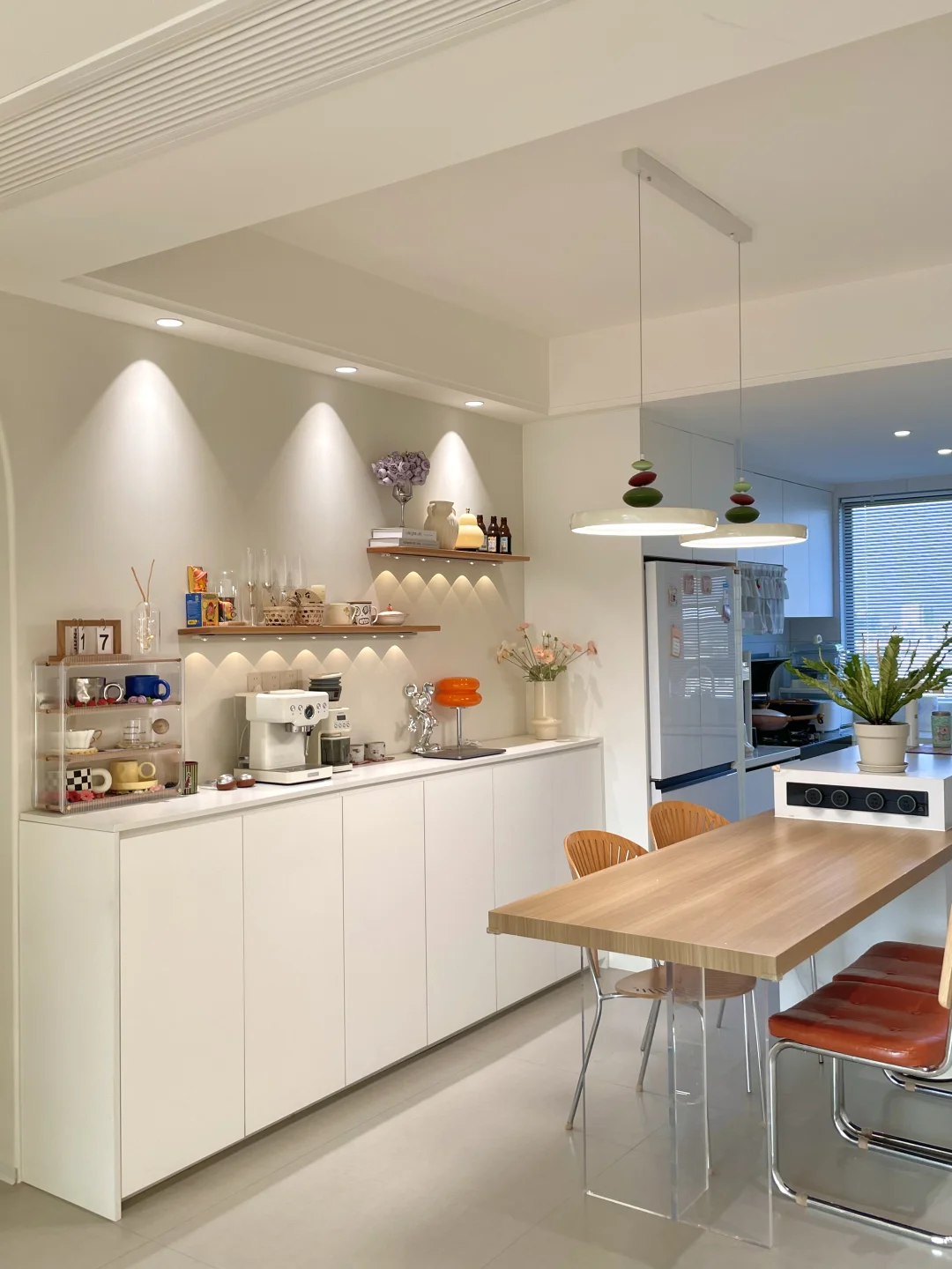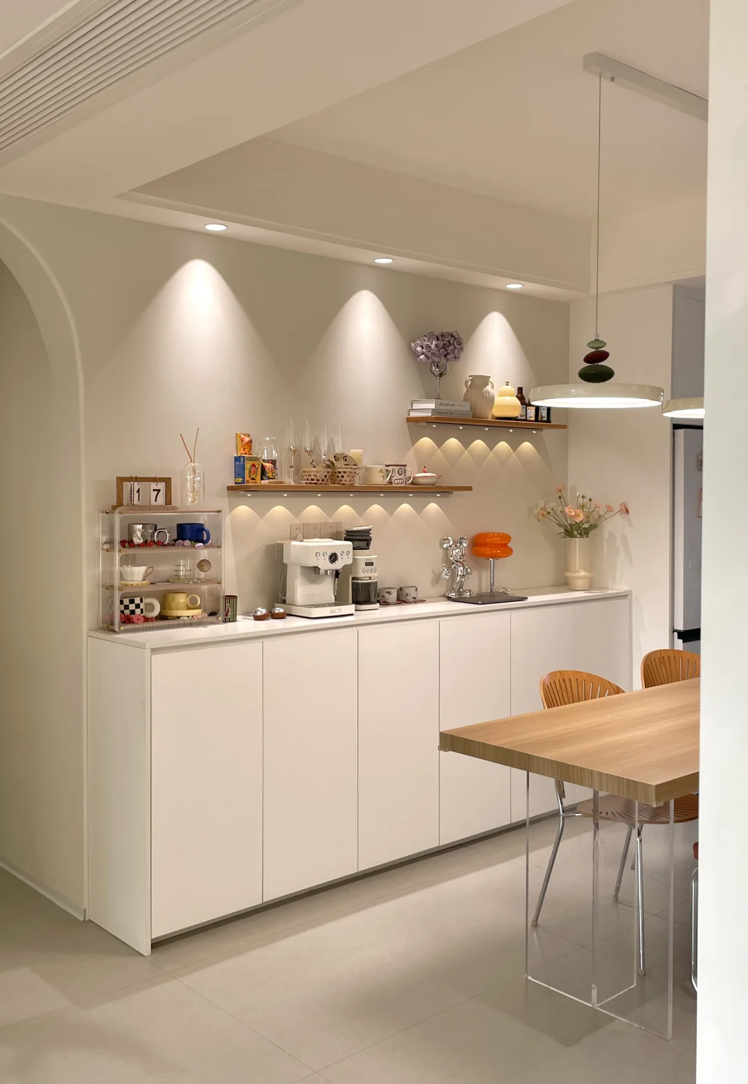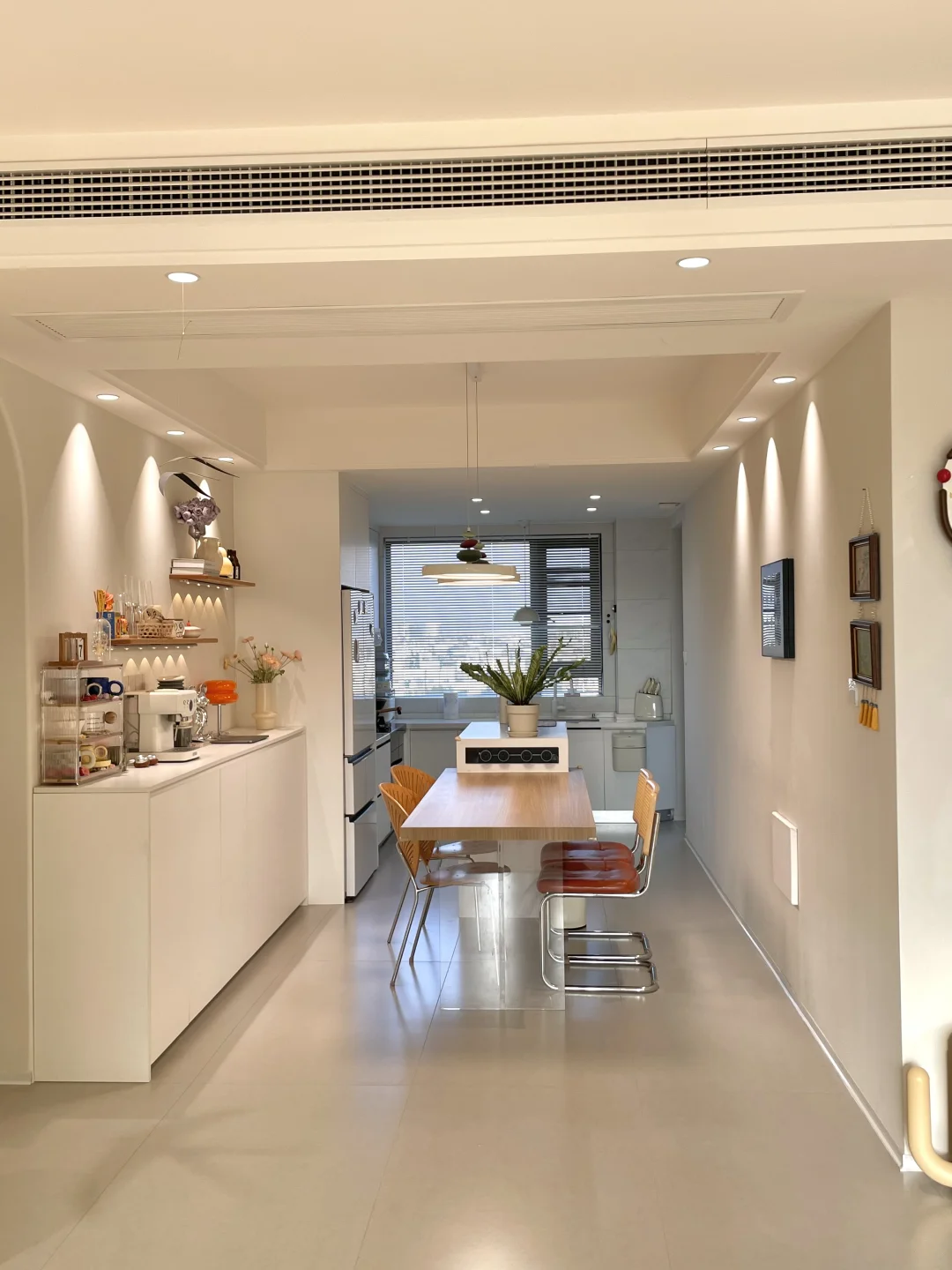餐厅开间只有2.76m 没有做千篇一律的定制满墙柜子 而是选择了半高的餐边柜 尺寸:长2.6m高1m深40cm 上面适当空间留白,不压抑 搭配上一字板置物架,可以收纳一些物品 适配很多种家装风格 尺寸图放最后了,需要可以参考~