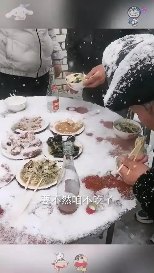 “凉菜上落着雪,筷子夹起来直冒白气!”视频里最戳人的,是乡亲们裹着军大衣蹲在雪地里的模样:有人把羽绒服帽子拉到只露眼睛,有人用围巾裹住脸只留鼻孔喘气,可手里的酒杯碰得叮当响。更绝的是那盘“雪花牛肉”——凉拌腱子肉上落满雪粒,被网友调侃“自带盐粒,省了调料钱”。