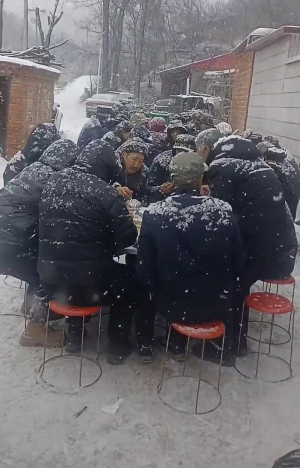 雪还在下,宴席散场时,乡亲们互相拍着身上的雪,鞋上的冰碴子在太阳下闪着光。有网友留言:“这哪是吃席?这是中国人最朴素的浪漫——天大的事,也大不过人情;再冷的天,也冻不住人心。”