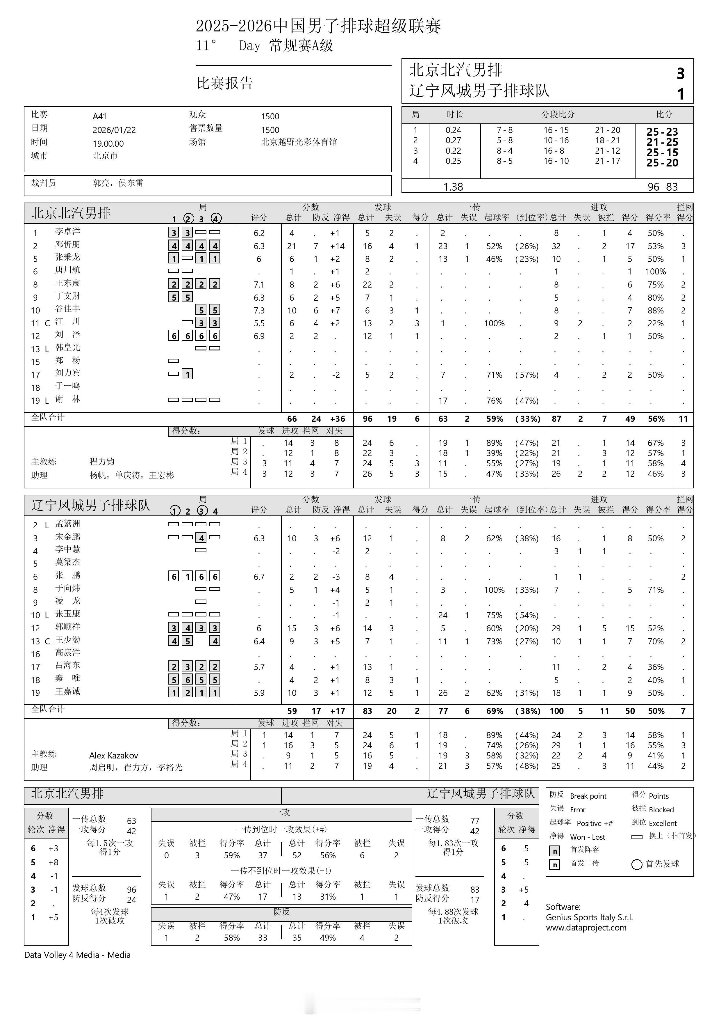 【中国男排超级联赛 北京3-1辽宁】22日晚上,A级常规赛第11轮,北京北汽在主场以3-1(25-23, 21-25, 25-15, 25-20)力克辽宁凤城,收获第六胜。辽宁十一连败。邓忻朋21分,谷佳丰10分;郭顺祥15分,宋金鹏、王嘉诚各10分。