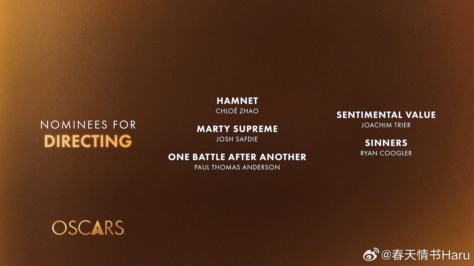 第98届奥斯卡最佳导演提名赵婷 《哈姆奈特》 乔什·萨弗迪 《至尊马蒂》保罗·托马斯·安德森 《一战再战》约阿希姆·提尔 《情感价值》瑞恩·库格勒 《罪人》
