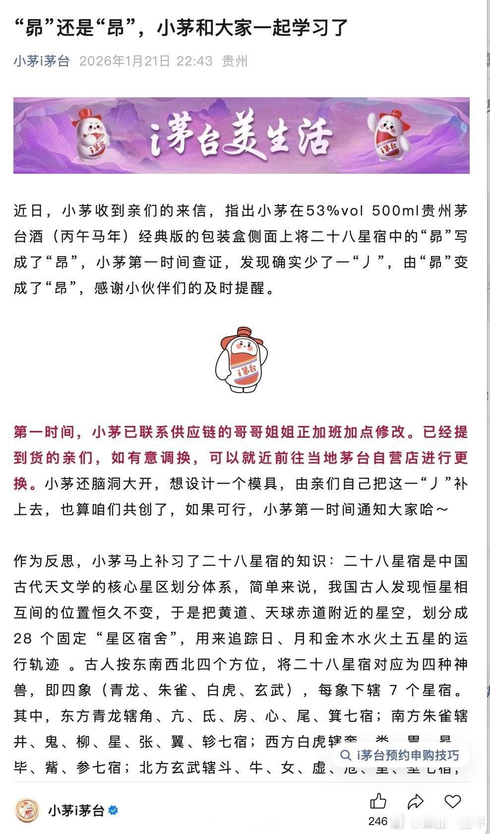 1899元错版马茅已被炒到2800元 马年茅台外包装所印制的星宿图中,“昴宿”的 “昴” 字被错印成了形近字 “昂”。错版马茅因稀缺性导致的升值空间