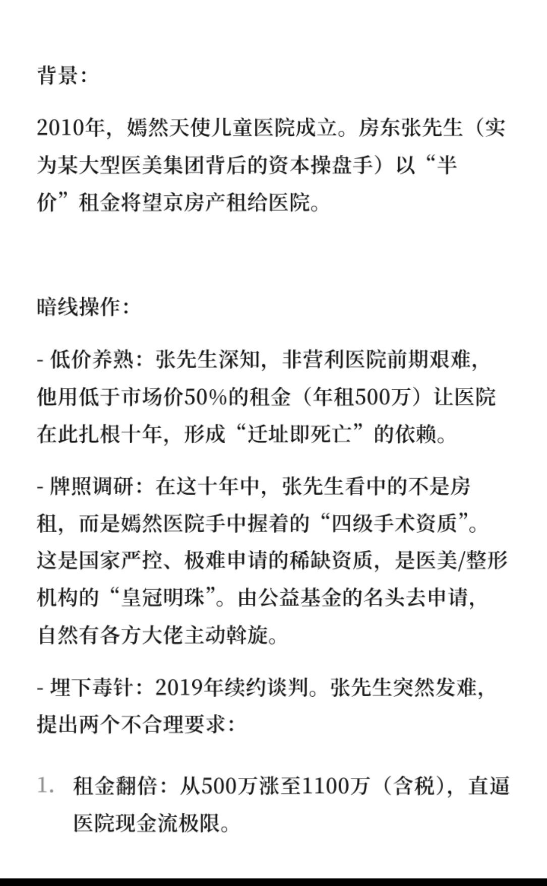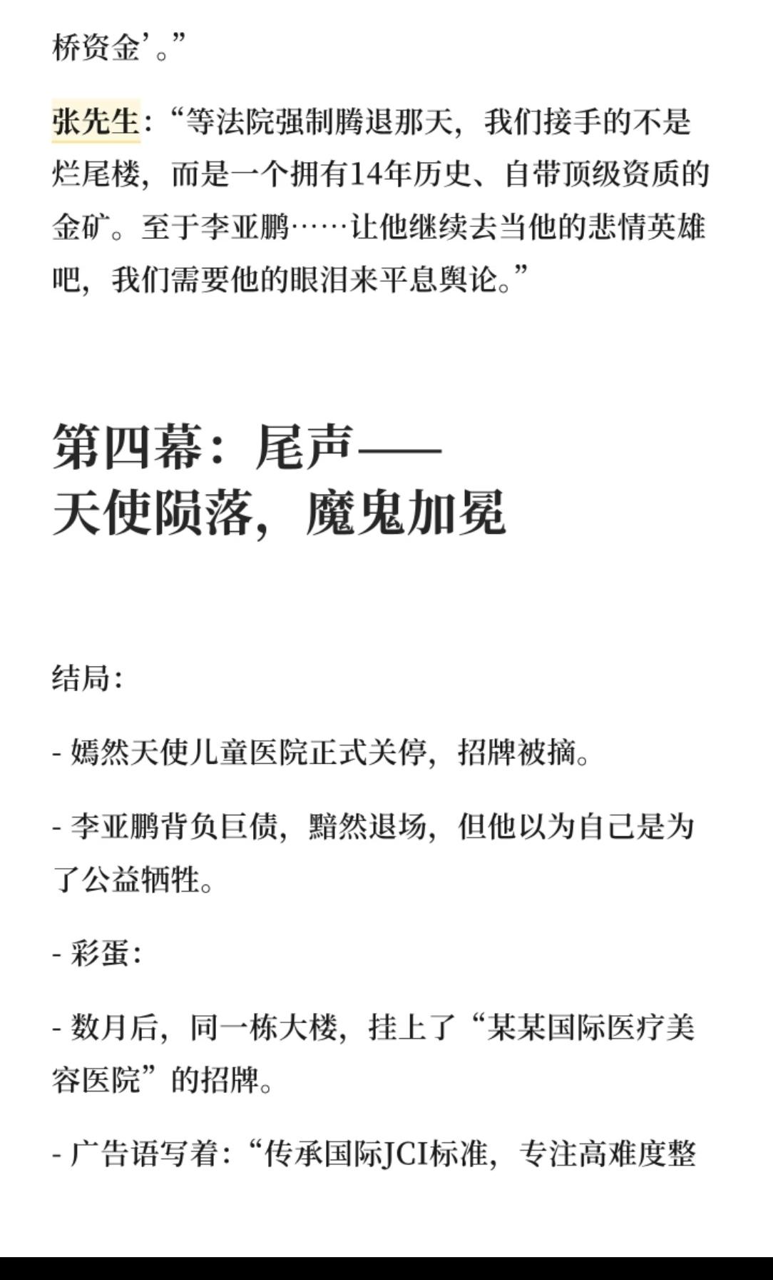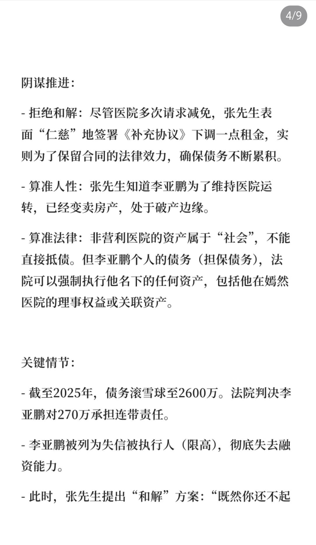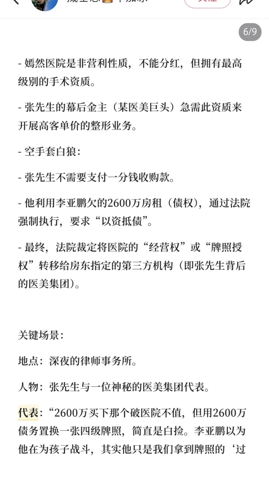 李亚鹏的嫣然儿童医院真相是这样的? 一个网友分析,细思极恐:就是说现在嫣然有四级的资质,管理实际铁桶一块没得插手,唯独在债务关系上对外欠房东一笔钱。因为这个资质现在稀缺,且事实上等于不再给民营医院新颁发了,所以房东通过追偿欠款的方式给嫣然施压,嫣然没钱搬迁也没钱继续运营,就算是打官司下场也是只有输,哪怕是直接注销也得把债务给解决了。至于这个债务解决那就是两种方案,第一种让嫣然自己把钱筹出来(肯定行不通,老李直播卖货多久了也没攒出来),要么就是有个第三方入场,通过注资控股的方式把这笔债给解决了。但是就这个数额,注资控股的话基本等于掌握决定性话语权,一笔房租债务钱就能直接到手控制一个有四级资质的医院,这一本万利做的估计搞医美都得眼红吧