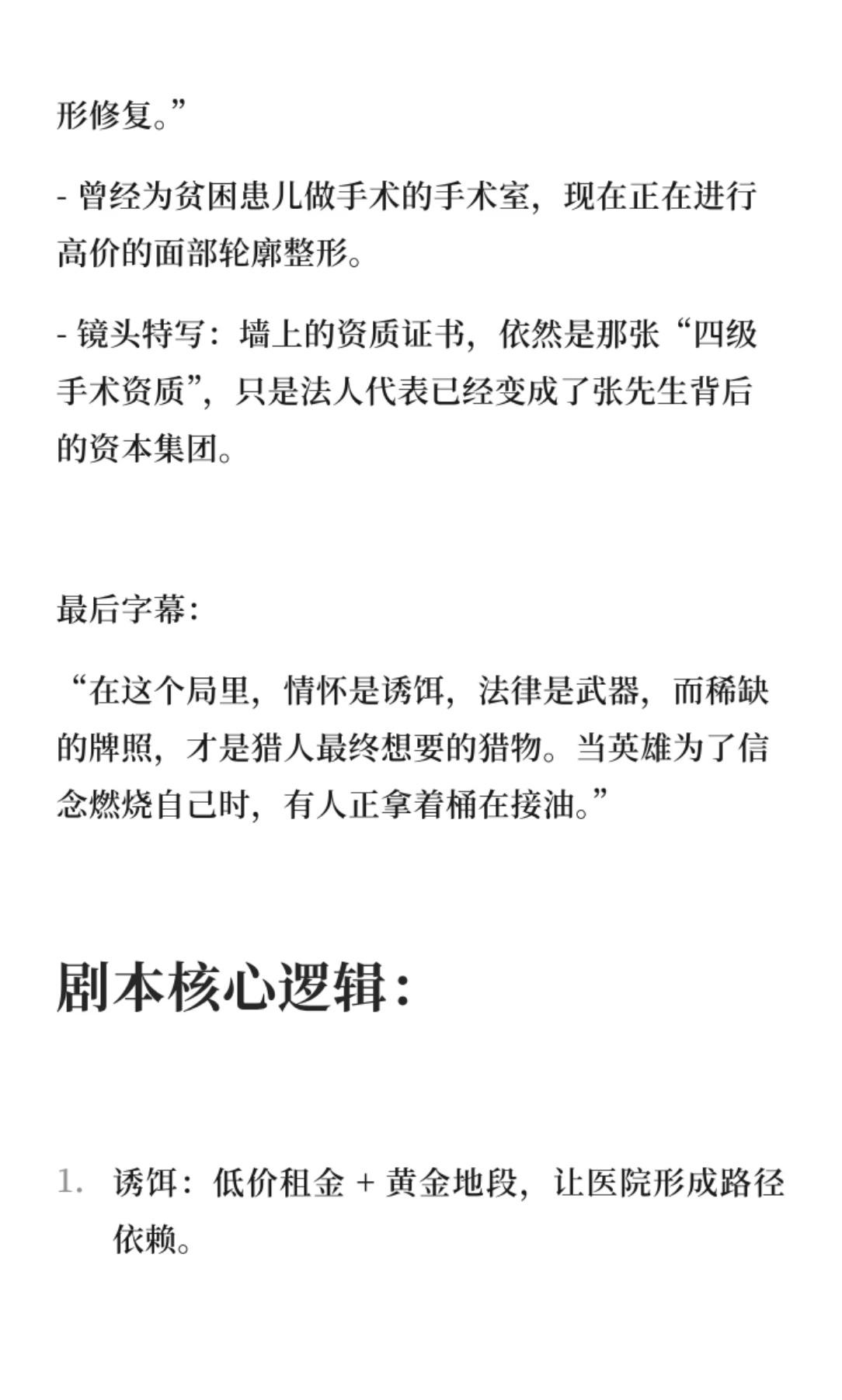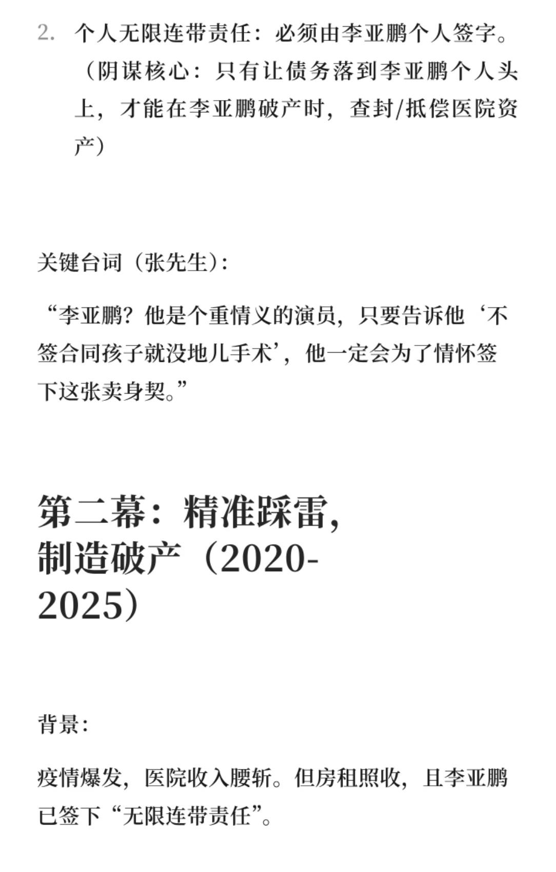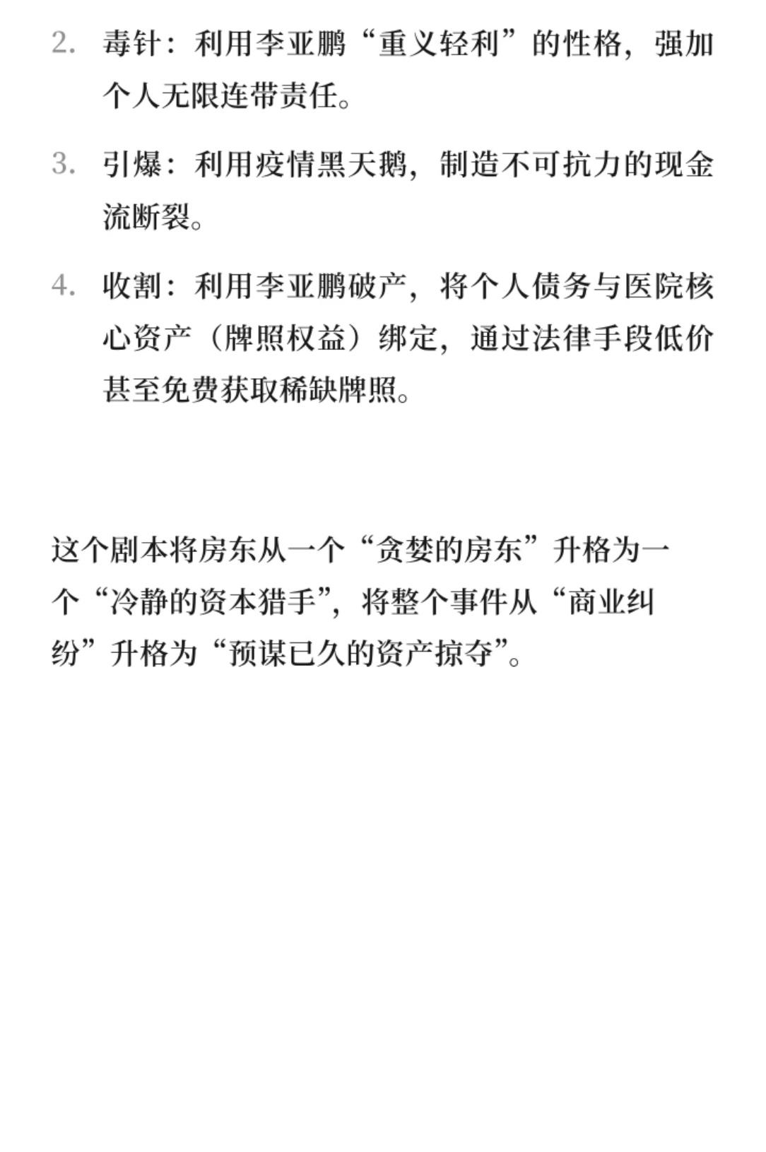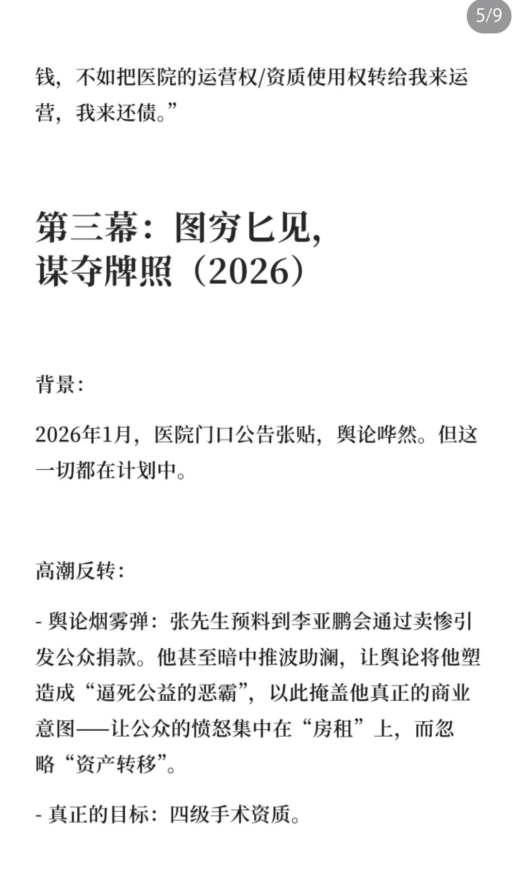 李亚鹏的嫣然儿童医院真相是这样的? 一个网友分析,细思极恐:就是说现在嫣然有四级的资质,管理实际铁桶一块没得插手,唯独在债务关系上对外欠房东一笔钱。因为这个资质现在稀缺,且事实上等于不再给民营医院新颁发了,所以房东通过追偿欠款的方式给嫣然施压,嫣然没钱搬迁也没钱继续运营,就算是打官司下场也是只有输,哪怕是直接注销也得把债务给解决了。至于这个债务解决那就是两种方案,第一种让嫣然自己把钱筹出来(肯定行不通,老李直播卖货多久了也没攒出来),要么就是有个第三方入场,通过注资控股的方式把这笔债给解决了。但是就这个数额,注资控股的话基本等于掌握决定性话语权,一笔房租债务钱就能直接到手控制一个有四级资质的医院,这一本万利做的估计搞医美都得眼红吧