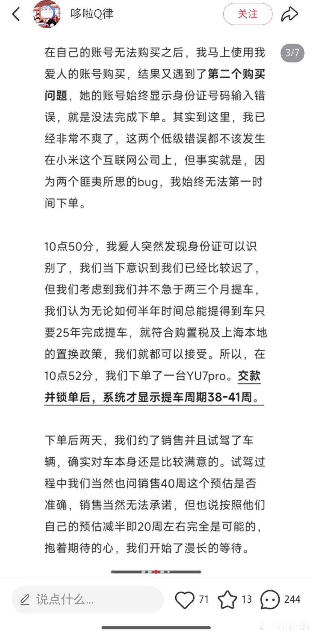 有一位yu7消费者起诉小米汽车。自己是因为听了网上攻略被识别成黄牛,据他说,他的配偶因为系统bug显示身份证识别错误。现在汽车已经可以交付了,但是还是决定起诉小米汽车。按照情况来看,汽车已经下线了,如果要起诉难度会比较大。不过我还是支持个人消费者用法律武器维护自己权益的,总比某些维权系博主实际上天天除了发老米负面的强。不过小米也应该思考一下,如果新版su7也爆火,该用一种什么方法,能够让消费者下单的时候也知道自己排多少号。虽然这个问题有点难,锁单都是一分钟好几万起,但如果能解决也能缓解汽车爆火带来的一些负面和法律风险。