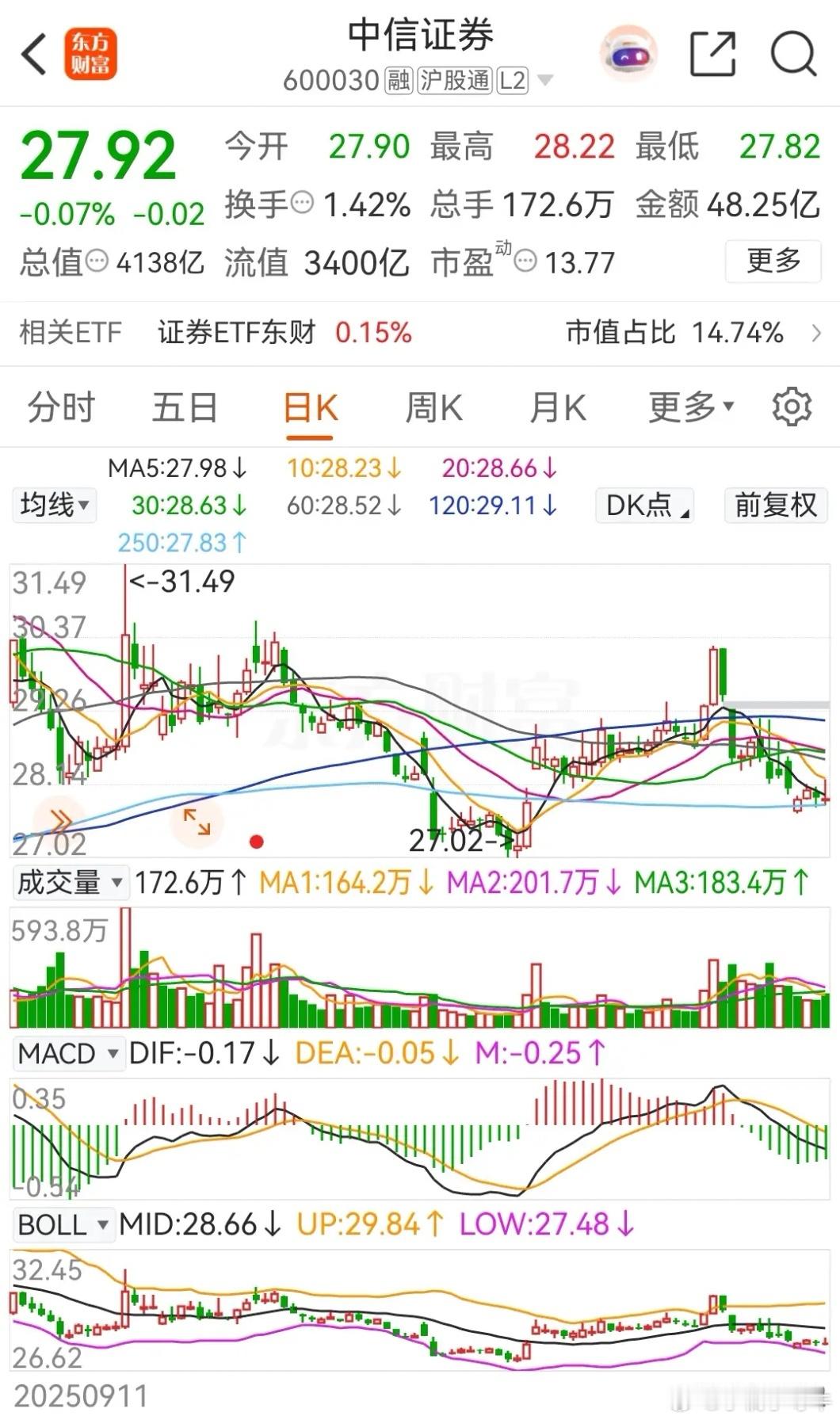 东方财富和中信证券冲高回落后在低位横盘整理,其中东财被主力资金连续六天净卖出。东方财富今天平开后冲高回落,最终平盘报收,目前的报价为23.31元。在资金流向上,连续六天被主力资金净卖出,今天的净卖出金额为2.6542亿元,近五个交易日被主力资金累计净卖出了 26.6882亿元,近20个交易日则是被主力资金合计净卖出了约38.338亿元。从走势上看,目前已经连续调整了八个交易日了,整体走势呈现出破位的态势,在2026年的上涨幅度已经缩水为0.56%了。中信证券今天低开后冲高回落,随之一直在水下震荡整理,收盘时股价下跌了0.07%,报价为27.92元。而在资金流向上,今天被主力资金净卖出了0.7482亿元,近五个交易日则是被主力资金合计净卖出了3.1445亿元。从当前的走势上看,自从新年的前两个交易日上涨以来一直都在调整,目前则是在底部年线处横盘整理了四个交易日。至于更详细的技术分析,可以查看上一篇中关于券商概念板块今天的走势分析。对于东财和中信证券来说,目前二者面临的共性风险有,政策调控导致的业绩与股价背离短期内或持续,需警惕流动性变化冲击。而对于东方财富,若市场缩量或减持压力加剧,高估值可能引发抛压。中信证券,目前越秀资本减持1%股份(约40亿元)及信用风险上升,短期承压明显。