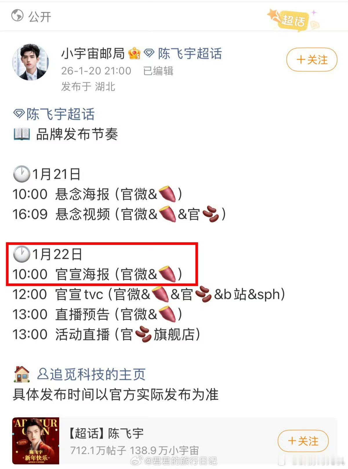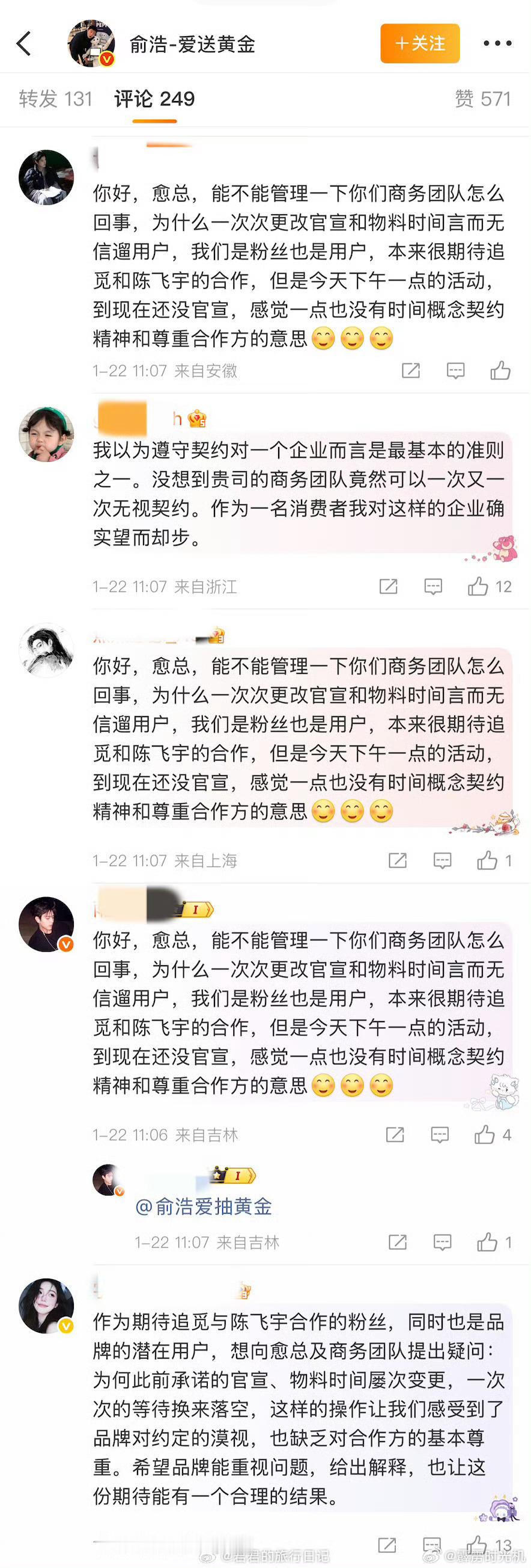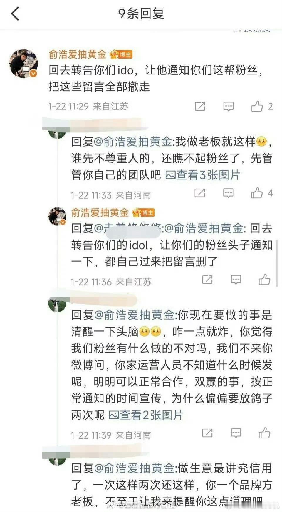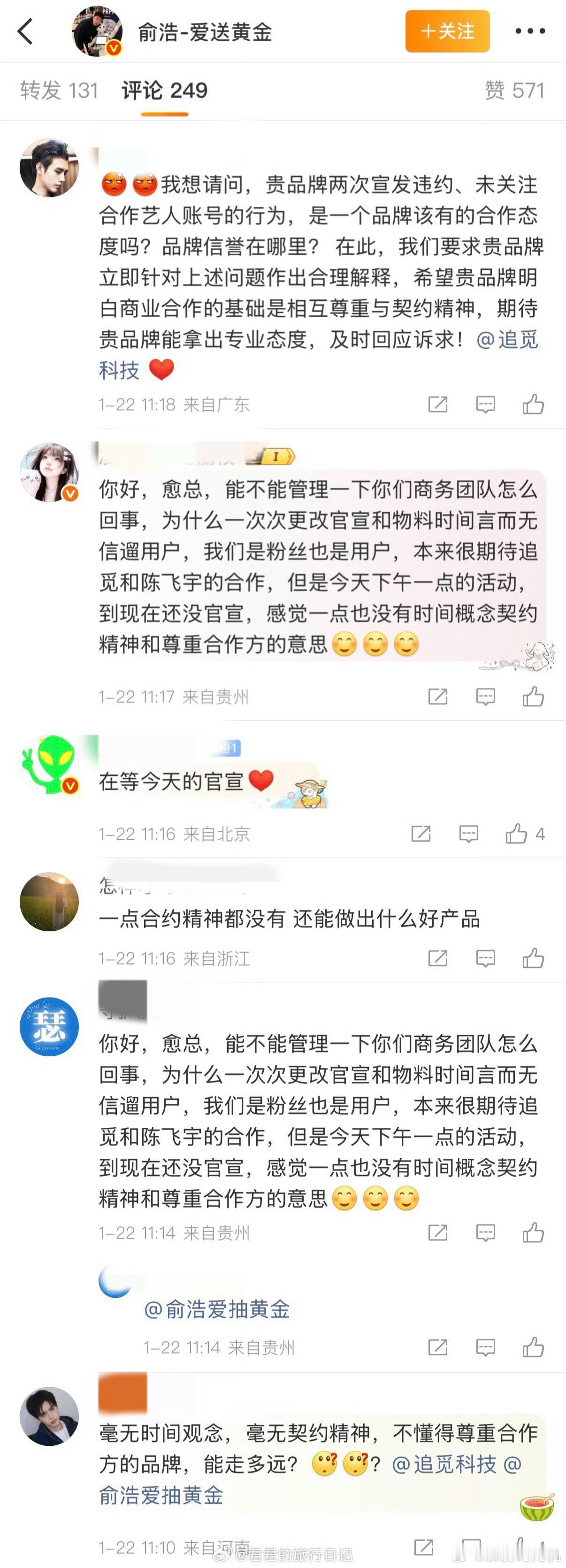 啊!陈飞宇今天有代言要官宣,但官宣时间跟之前对接给粉丝的不一样(晚发了一小时),粉丝去冲官方和CEO,说宣发违约和不尊重没有时间概念。然后品牌CEO也活力全开,就这么大家打起来了……追觅CEO俞浩怒怼陈飞宇粉丝