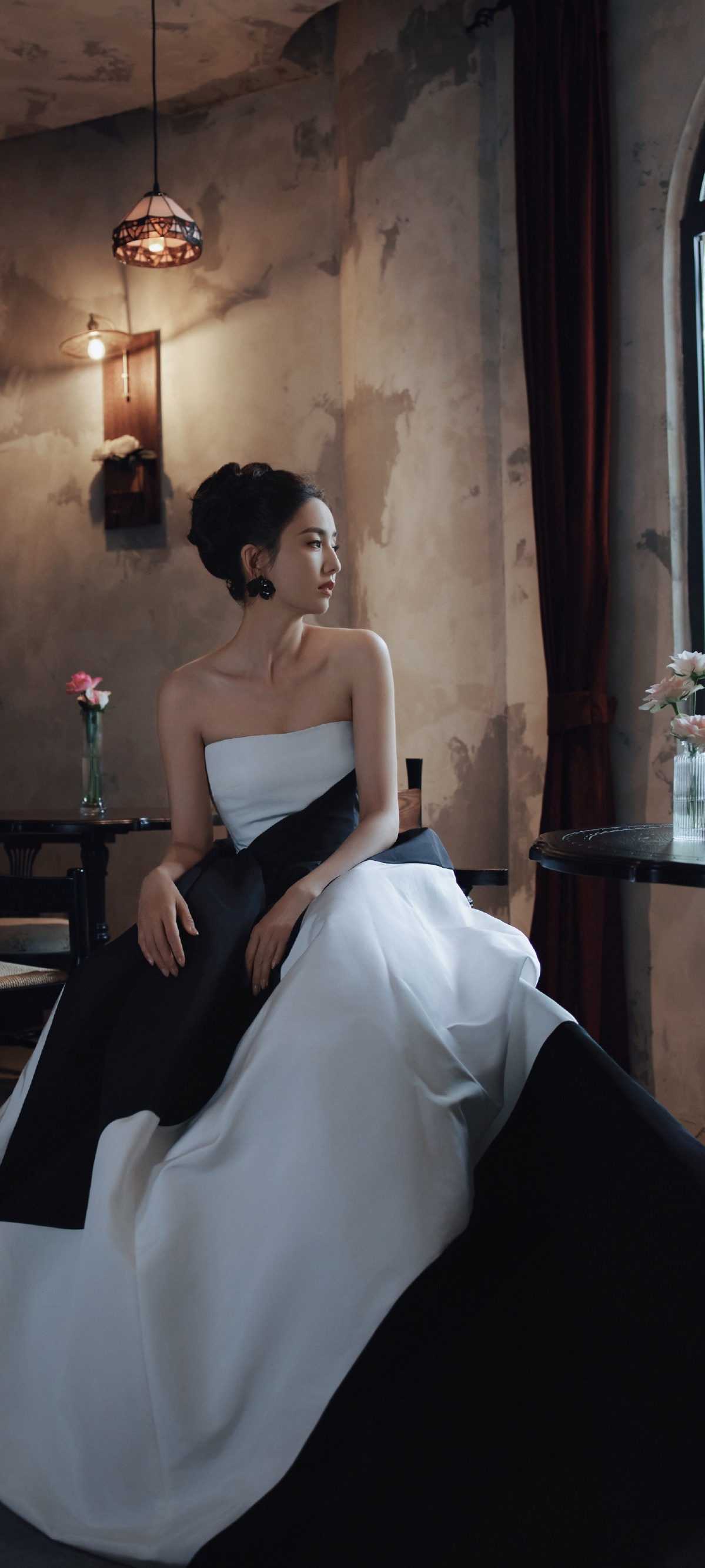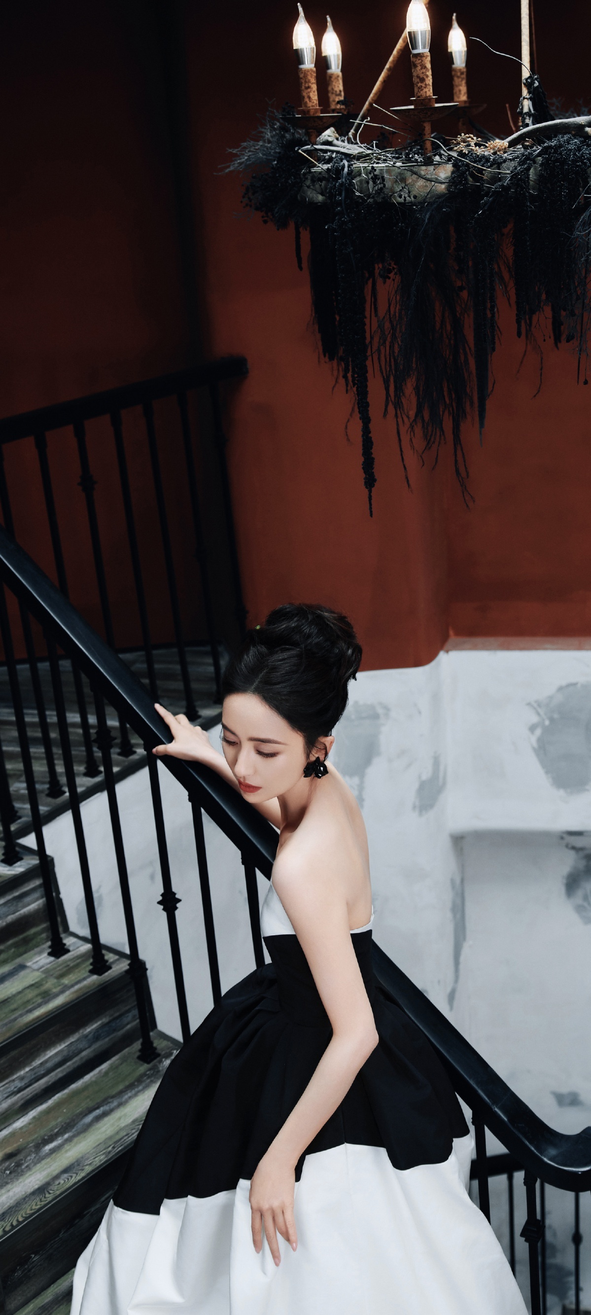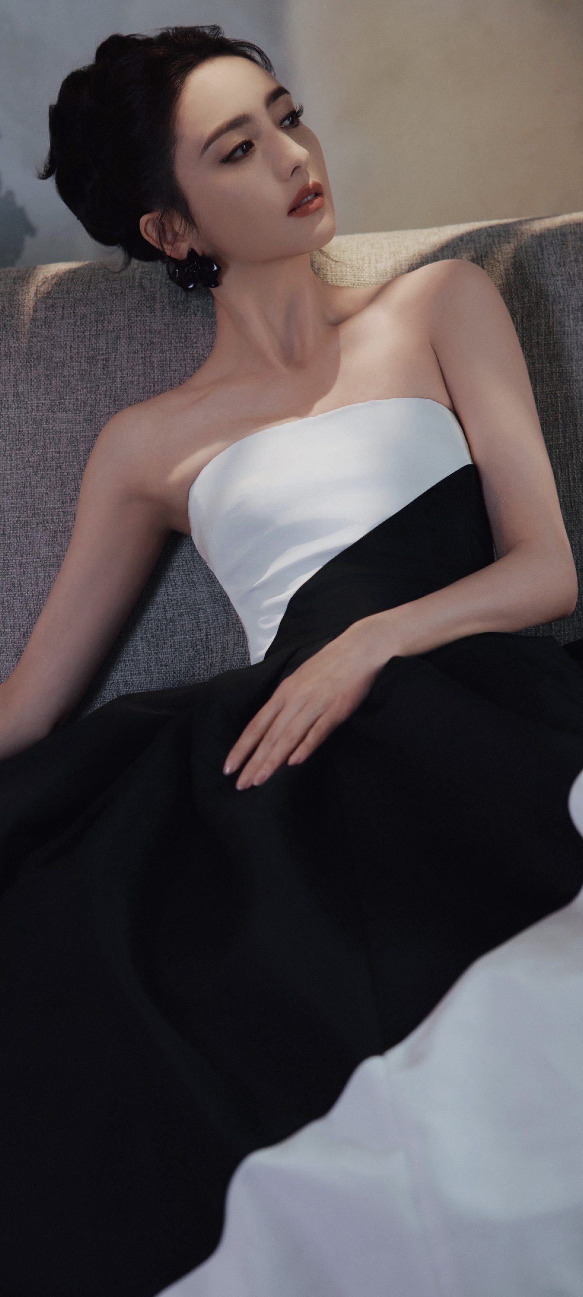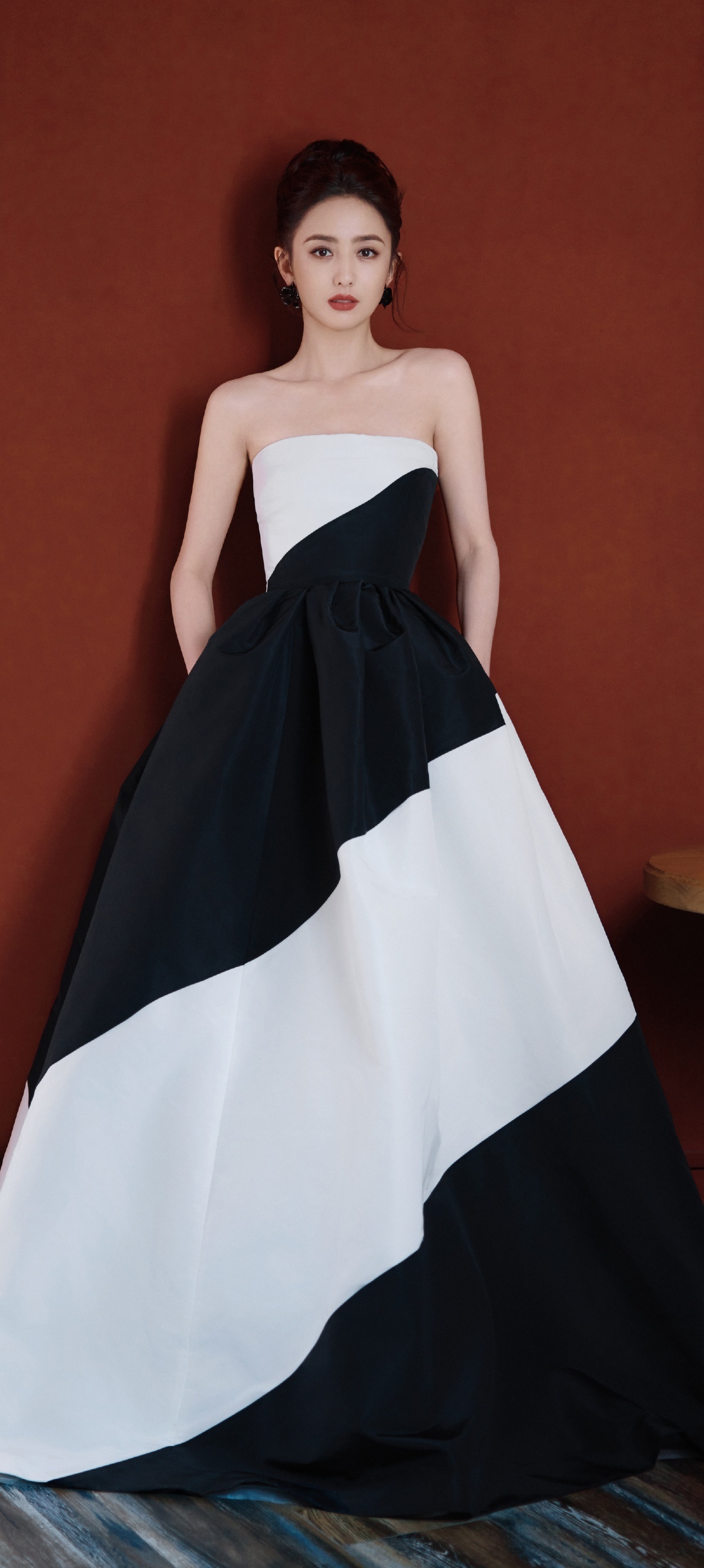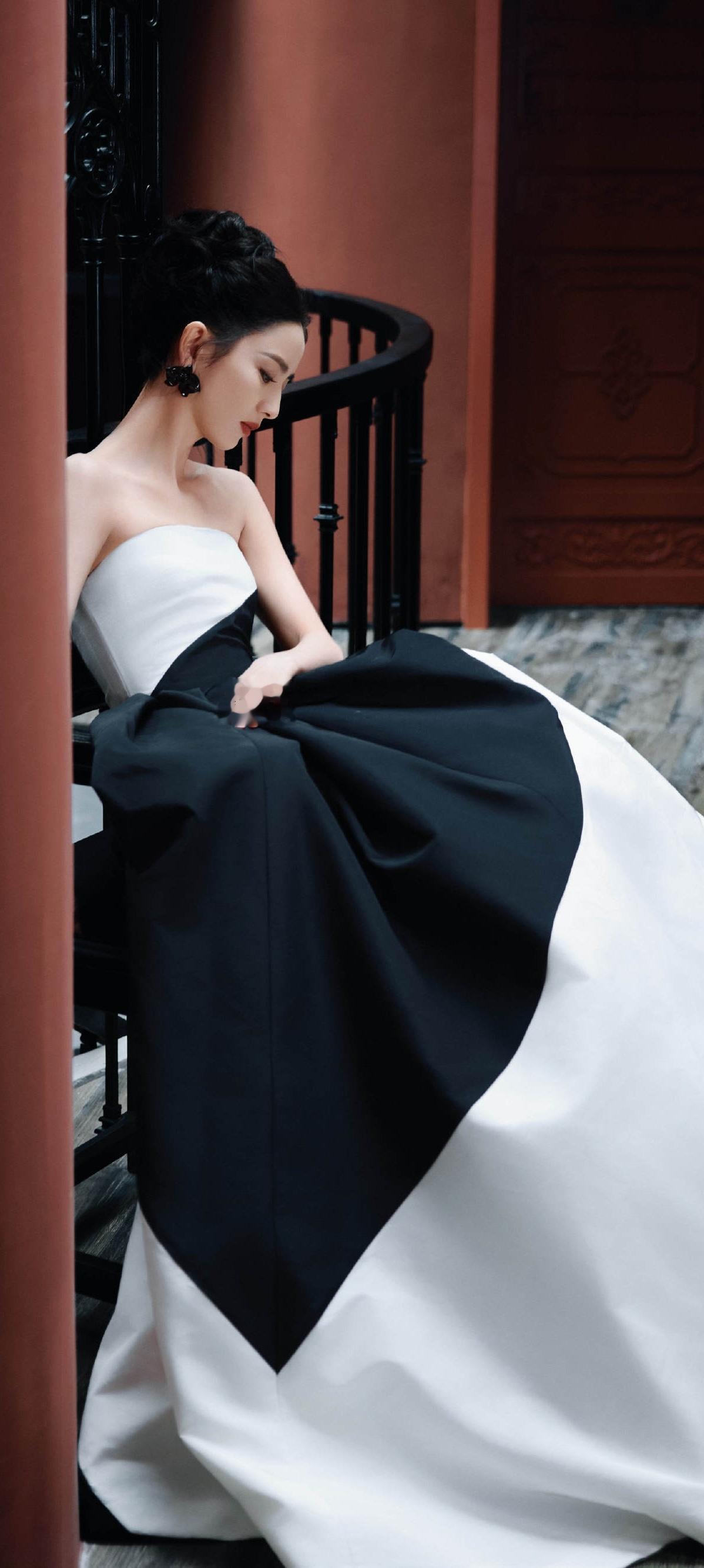 佟丽娅穿搭壁纸,黑白拼接抹胸裙,沉稳优雅百花赴会。佟丽娅