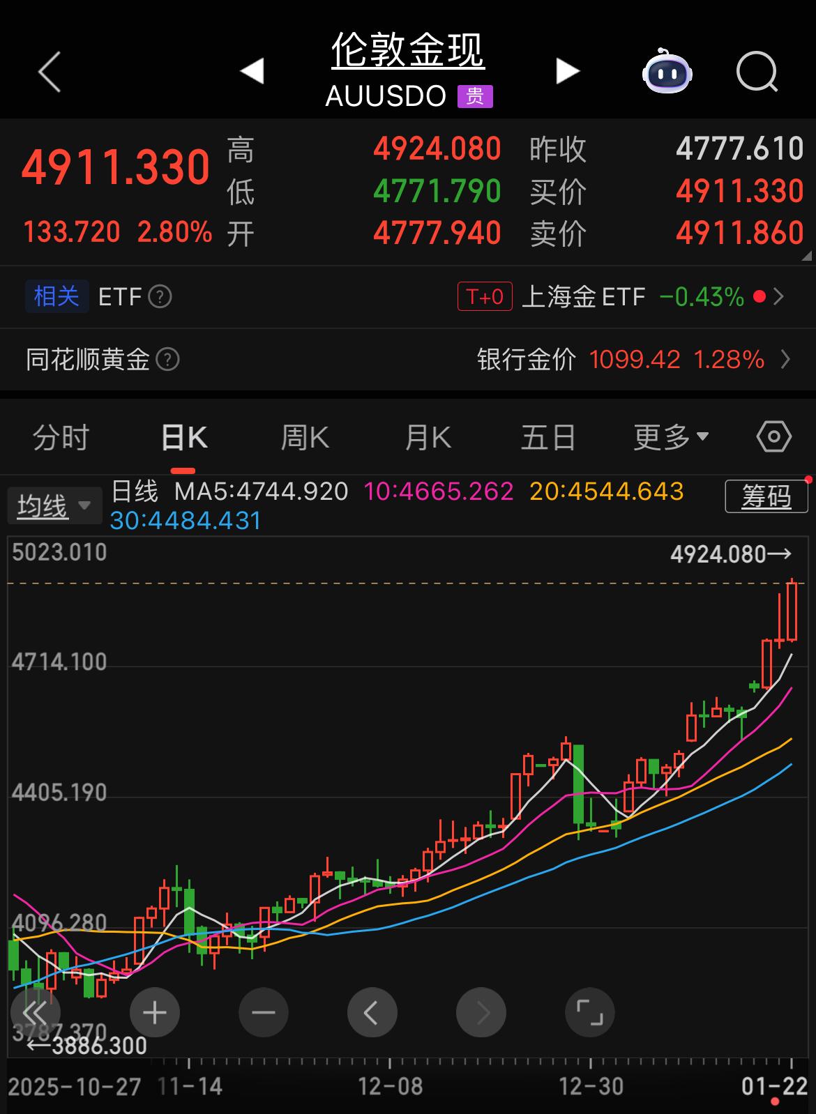 现货黄金突破4900美元 1月23日,现货黄金站上4900美元/盎司,刷新历史新高,距离5000美元仅一步之遥。2026年已涨超13%。 金价不停涨,涨不停!昨天,高盛上调2026年底金价到5400美元。这波贵金属牛市,现在还能不能上车?