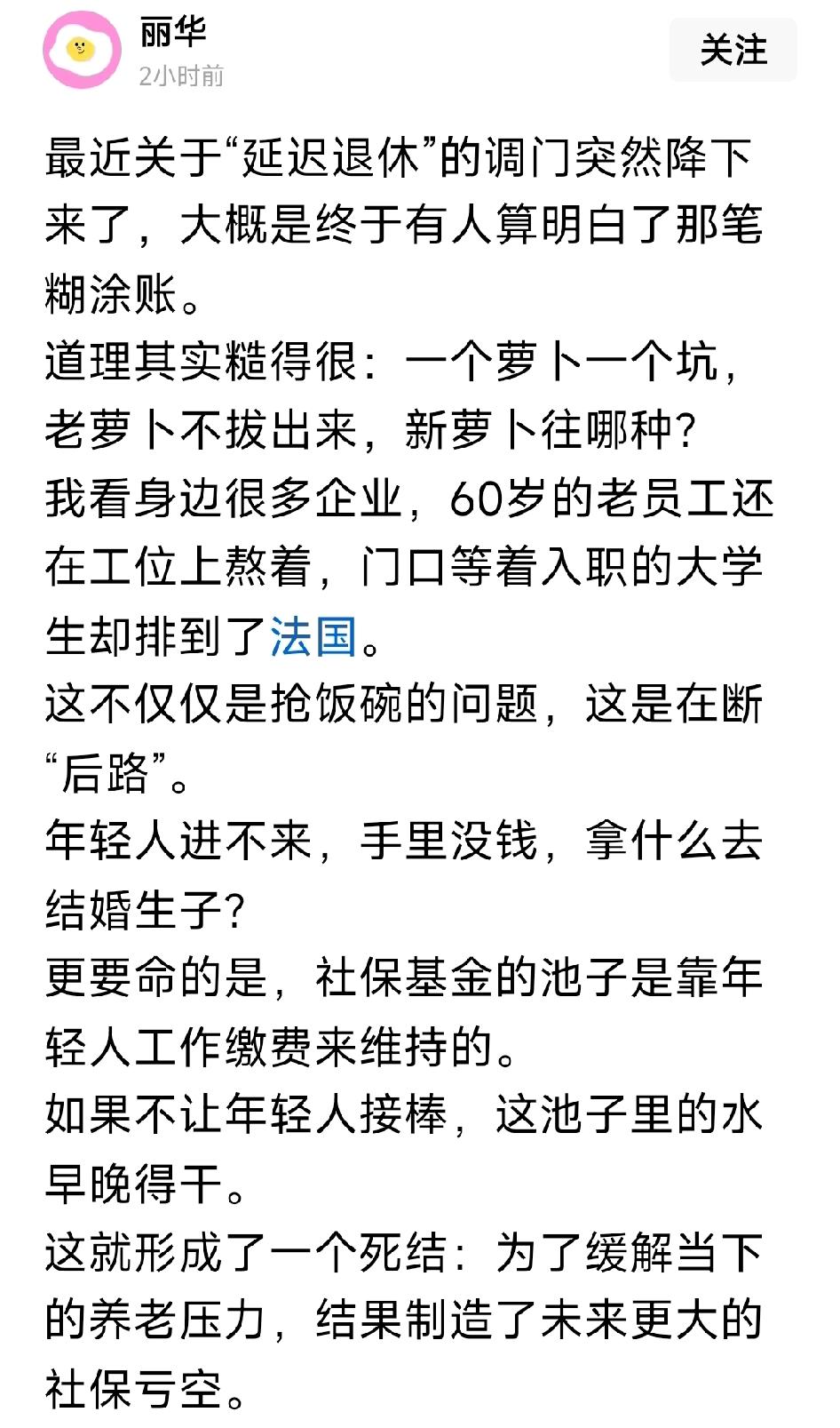 按工龄和年龄同时算,满足一个就强制退休给年轻人让路,退休后不可以继续留岗,想继续发光发热的可以从事辅助性的临时岗位,现在太多退休人霸占着有限的工作岗位了,特别是女性岗位。 女性50岁退休,正好帮儿女带第一个孩子。 男性55岁退休,送长孙上下学,妻子在家帮忙照顾二胎。这是现在社会薪资水平决定的。如果普通男职工月收入在1-3万,可以独立养4口之家,可以考虑上一代延迟退休。工龄满30年可以自愿选择是否退休,年龄到了60岁强制退休,这样才好。 没毛病,应该50岁退休,腾出岗位给年轻人,自己还可以帮儿女带孩子,照顾老人。一举几得。退休差别 弹性退休规则 工龄退休工资 退休过渡期 退休年龄调整 退休年限延长 退休职工工龄
