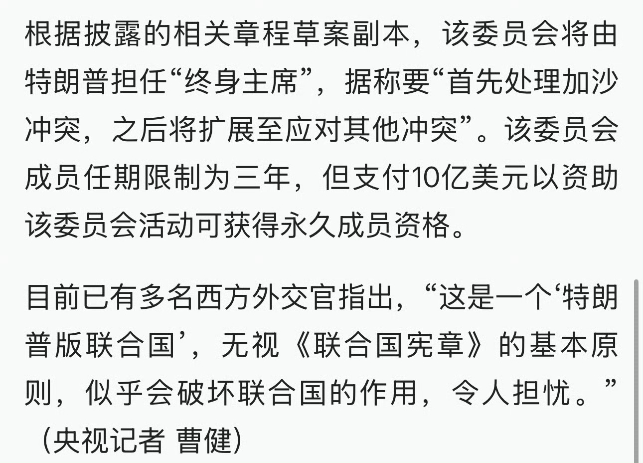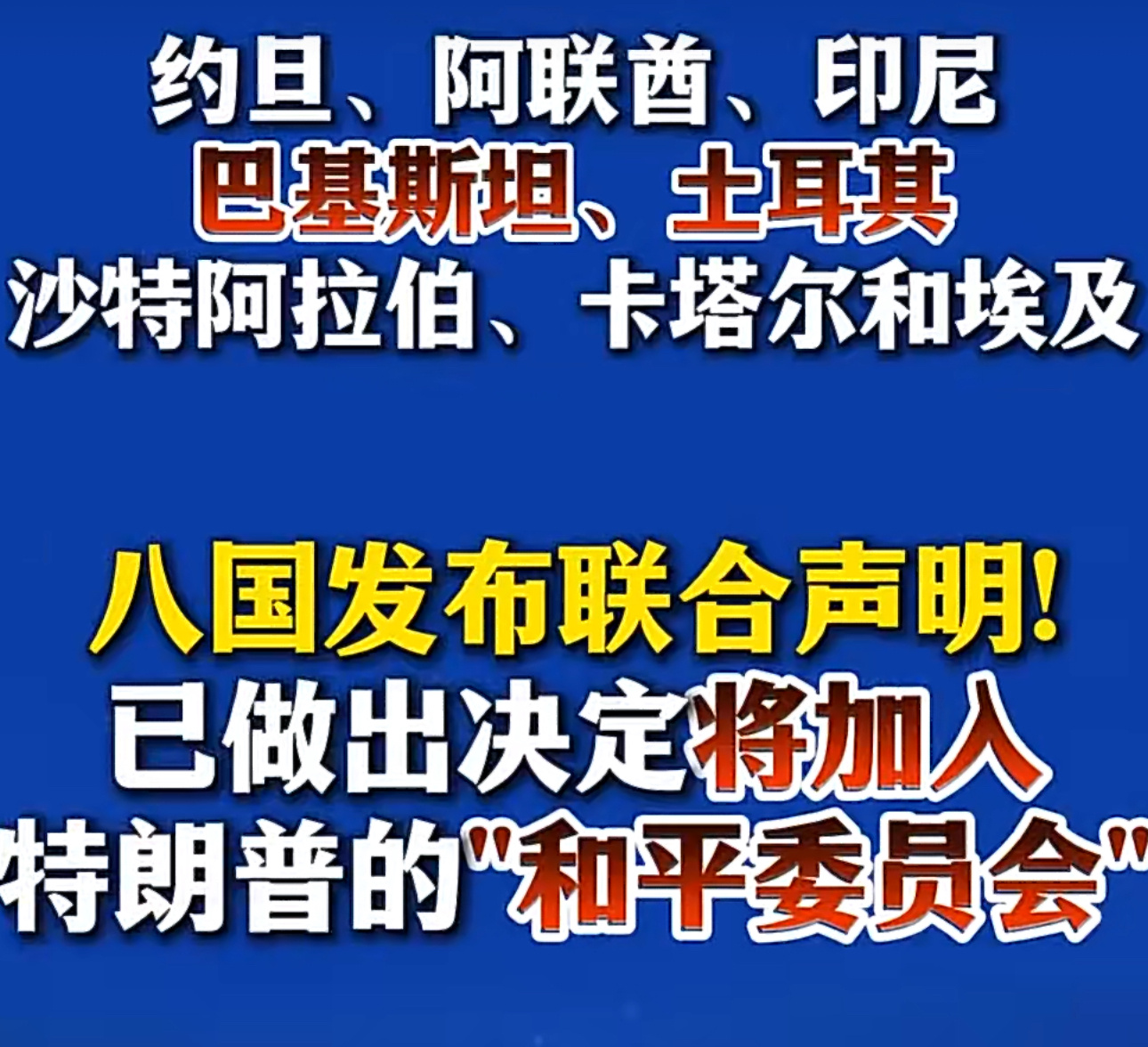 从拖欠联合国、世卫组织会费的老赖,摇身一变,就成了担任“终身主席”,从每个国家收钱10亿美元的和平使者特朗普这个算盘打的真响,无赖本质也完全显现……八国联合声明将加入和平委员会热点观点 八国联合声明将加入和平委员会
